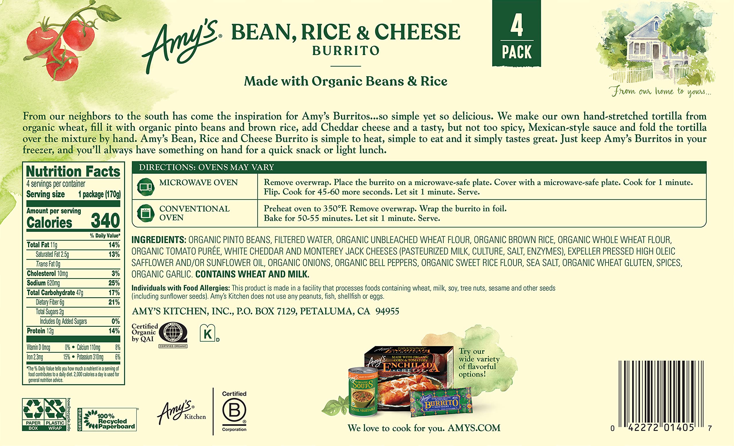 Made with organic ingredients: Amy's Burrito is made with organic beans, cheese, and rice, which means that the ingredients used to make this product are grown without synthetic pesticides and fertilizers, and are non-GMO. Quick and easy to prepare: This frozen burrito is a convenient and easy meal solution that can be prepared in just a few minutes, making it a great option for busy individuals. Good source of protein: This burrito is a good source of protein, which is an important nutrient that can help keep you feeling full and satisfied. The beans and cheese used in this product are both excellent sources of protein. Delicious and satisfying: Amy's Burrito is a flavorful and filling meal that is sure to satisfy your hunger and taste buds. With its blend of organic beans, cheese, and rice, this product offers a delicious taste and satisfying texture that you won't find in other frozen burritos.