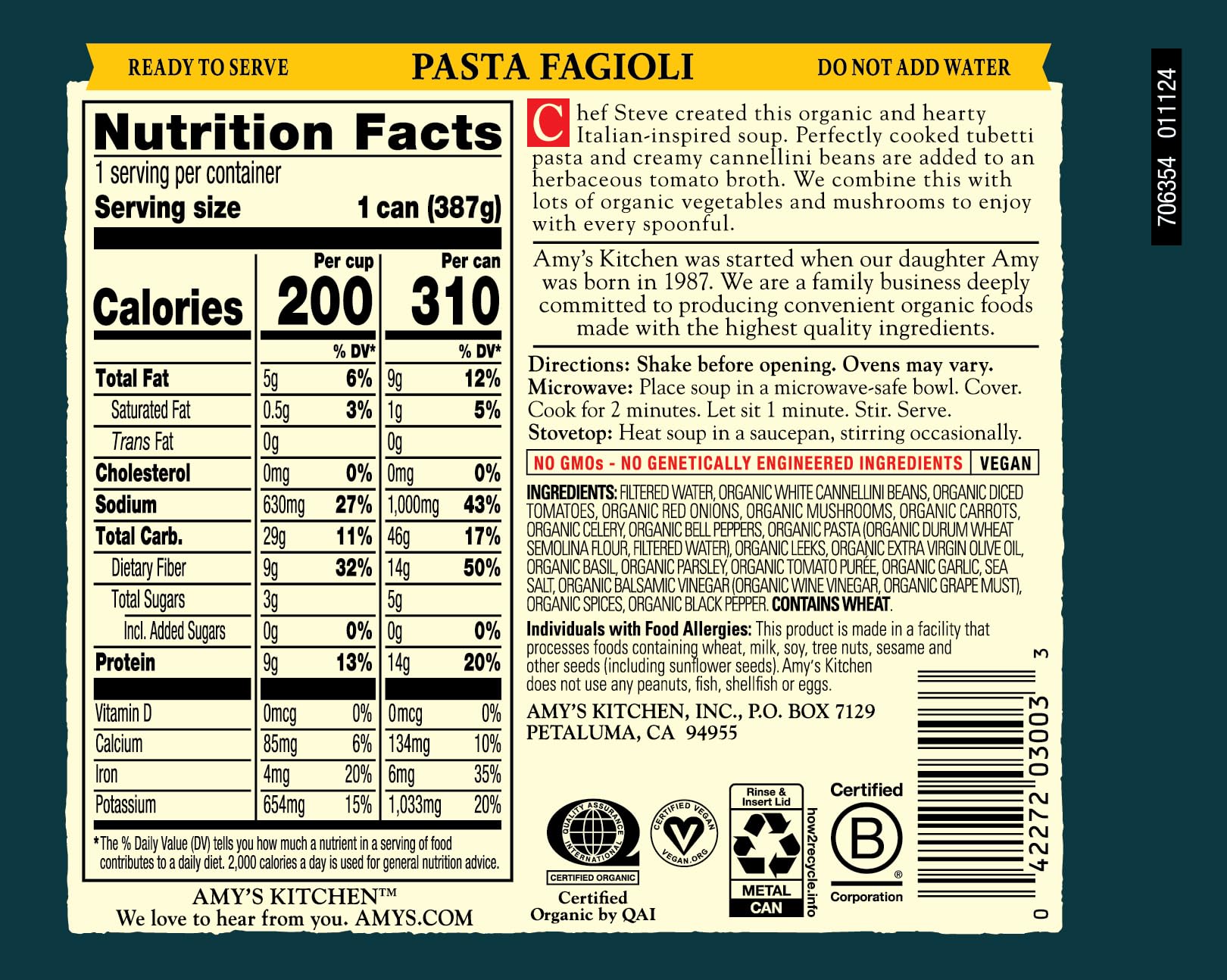 Amy's Soup, Organic Pasta Fagioli Soup, 13.65 Oz