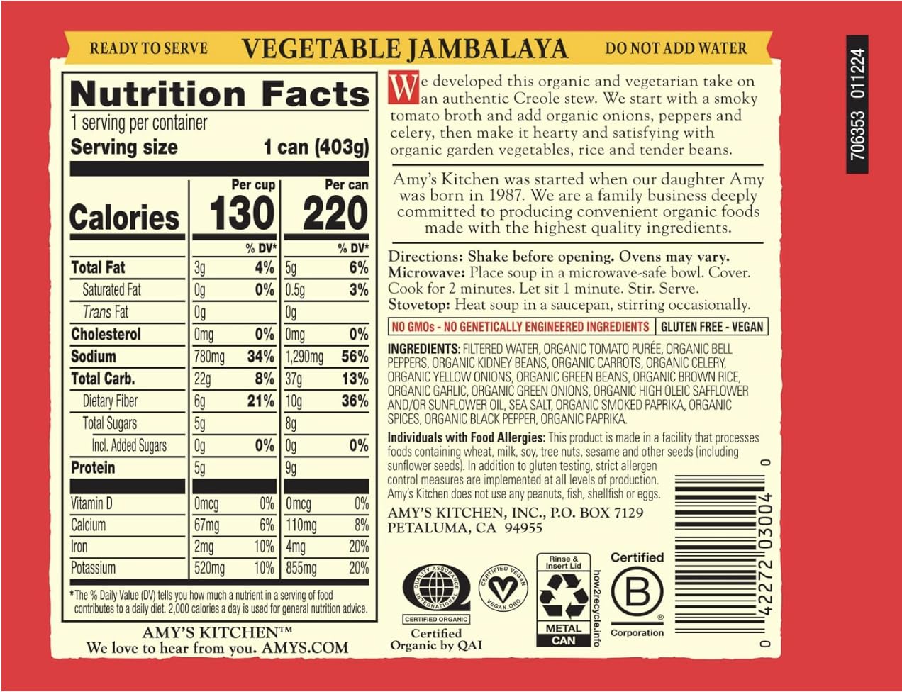 Amy's Soup, Organic Vegetable Jambalaya, 14.2 Oz