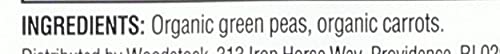 Woodstock frozen Peas & Carrot Organic. This product contains Natural Ingredients. This product is manufactured in United States. Freezing and Chilling Temperature of the product is frozen: 0 degrees.