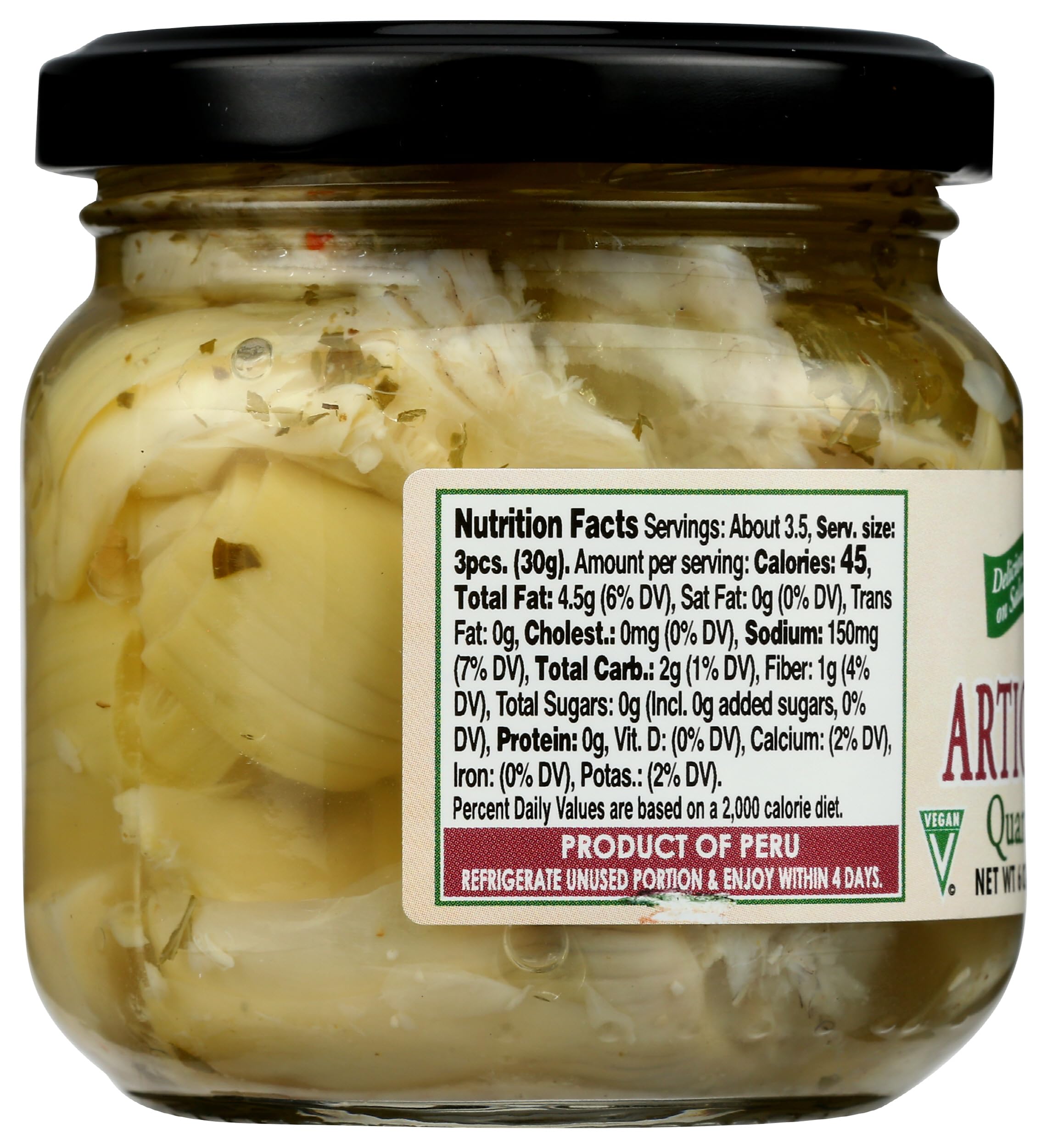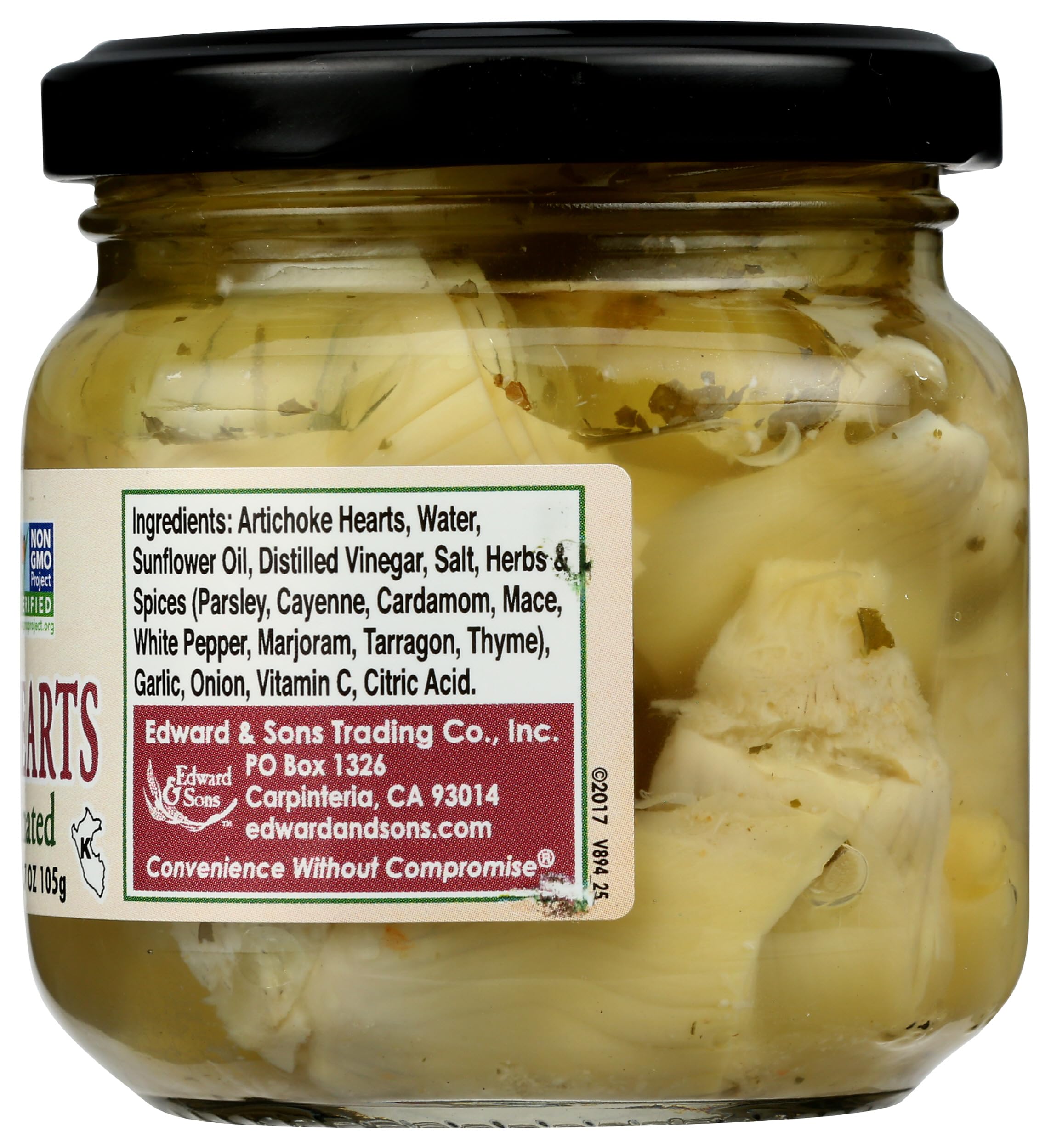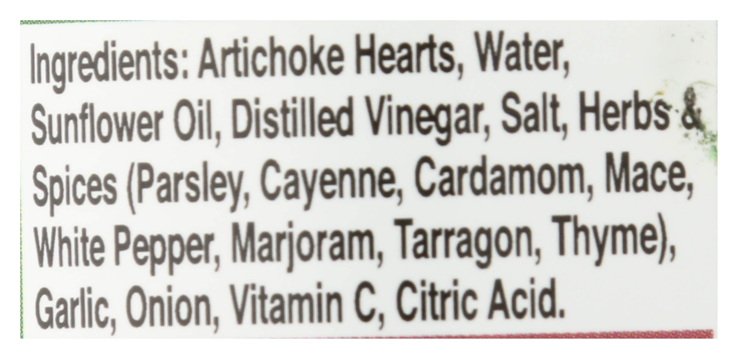 Ingredients: Artichoke hearts; Ascorbic acid; Bay leaf; Cardamom; Cayenne; Citric acid; Clove; Coriander; Dill; Extra-Virgin olive oil; Garlic; Ginger; Mace; Marjoram; Nutmeg; Onion; Parsley; Saffron; Salt; Spices; Tarragon; Vinegar; Water