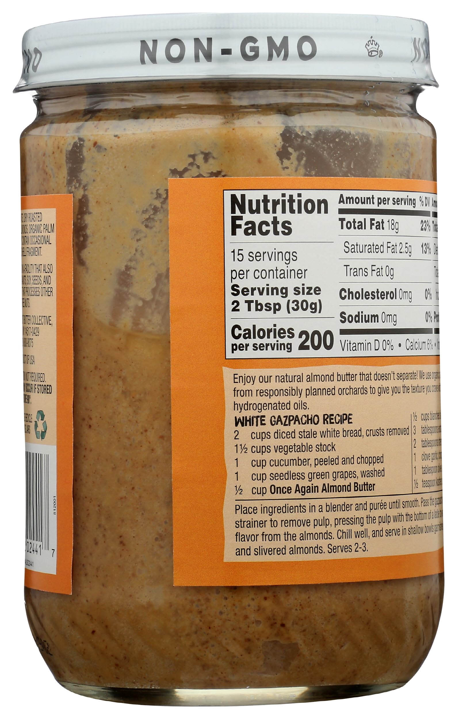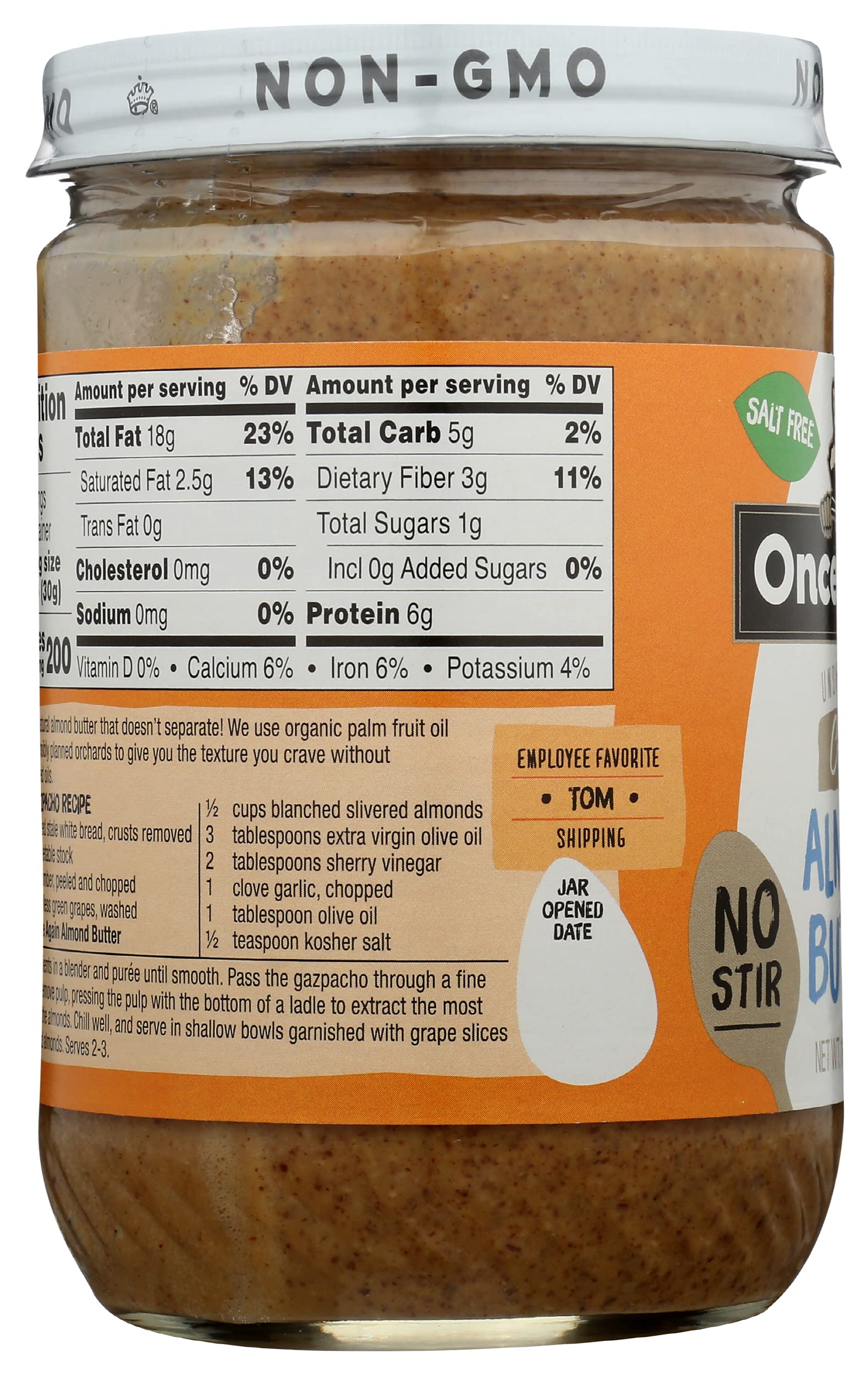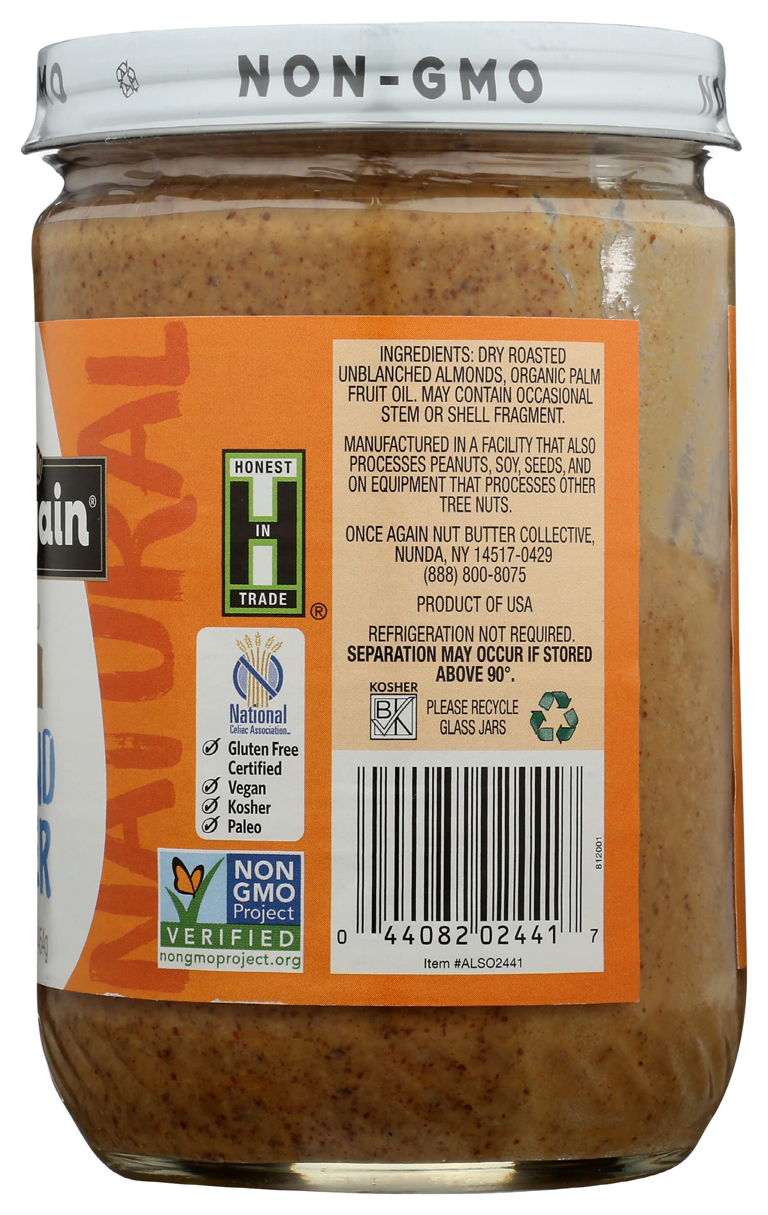Once Again Natural Creamy Almond Butter, 16oz - American Classic, No Stir - Salt Free, Unsweetened - Gluten Free Certified, Peanut Free, Vegan, Kosher, Paleo - Glass Jar