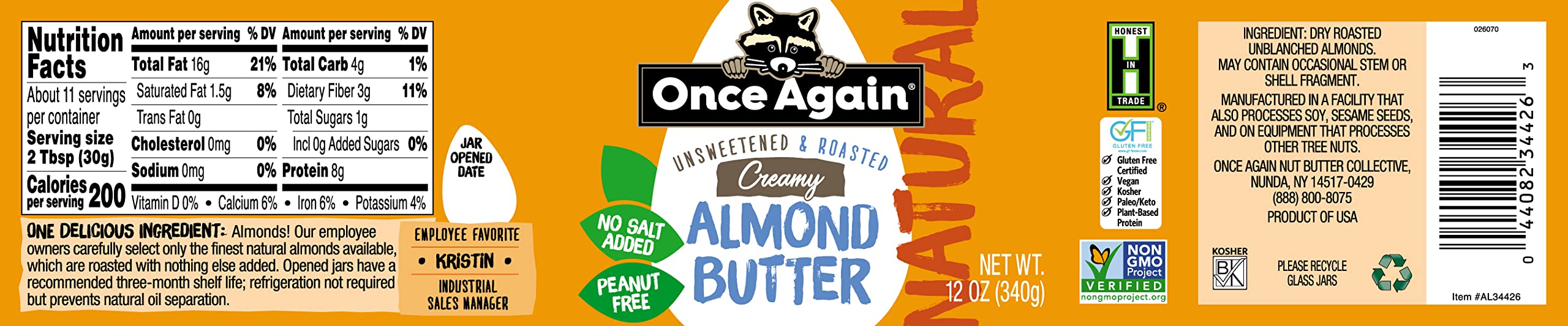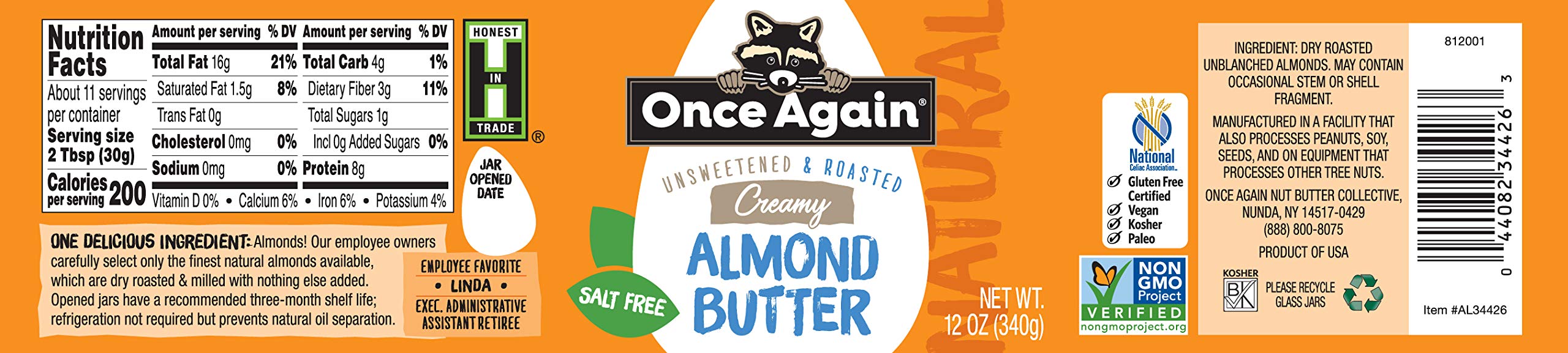 Once Again Natural, Creamy Almond Butter - Salt Free, Unsweetened - 12oz Jar