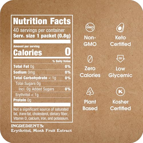 Monk Fruit In The Raw Sweetener Packets, 40 Ct, Keto Certified Monk Fruit Sweetener Packets, Zero Calories, Zero Net Carbs, Non-GMO Project Verified, Vega, Low Glycemic Index
