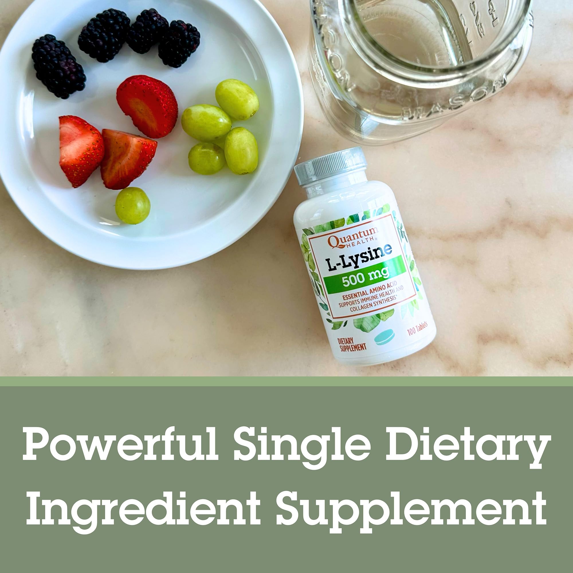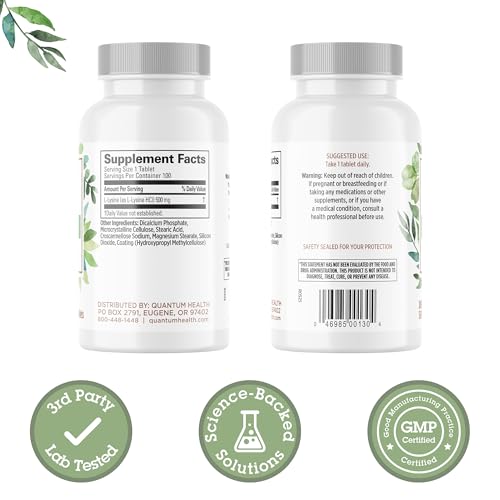 Quantum Health L-Lysine 500mg Essential Amino Acid Supplement - Supports Collagen & Protein Synthesis, Bone Health, Muscle Recovery and Immune Health - Vegan Friendly - 100 Tablets