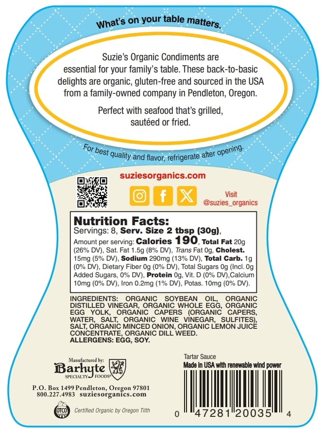 Suzie’s Organic Tartar Sauce – 8 fl oz | Certified Organic, Clean Ingredients, Gluten-Free, Non-GMO – Creamy & Tangy Seafood Condiment – Great with Fish, Fries & More