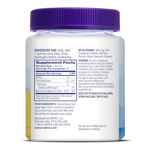 Natrol Kids Magnesium Gummies gently calm and relax little minds and bodies for those low in Magnesium and are safe and gentle for kids ages four and up.(1) Magnesium is an essential mineral that supports healthy muscle relaxation and function.(1) Made without artificial flavors, sweeteners, or synthetic dyes, this supplement is also non-GMO, vegetarian and gelatin-free. A tasty and convenient source of Magnesium, this magnesium supplement is 100% drug free and contains no milk, egg, fish, crustacean shellfish, tree nuts, peanuts, wheat, soybeans or sesame. Suggested Use: Kids, take one gummy once daily. Chew thoroughly before swallowing. Natrol is dedicated to creating innovative, quality products, to help you maintain good health and thrive in your busy, modern lifestyle. (1)These statements have not been evaluated by the Food and drug administration. This product is not intended to diagnose, treat, cure or prevent any disease. (2)Nielsen, xAOC, 52 weeks ending 10/26/24, Sleep Aid Supplements.