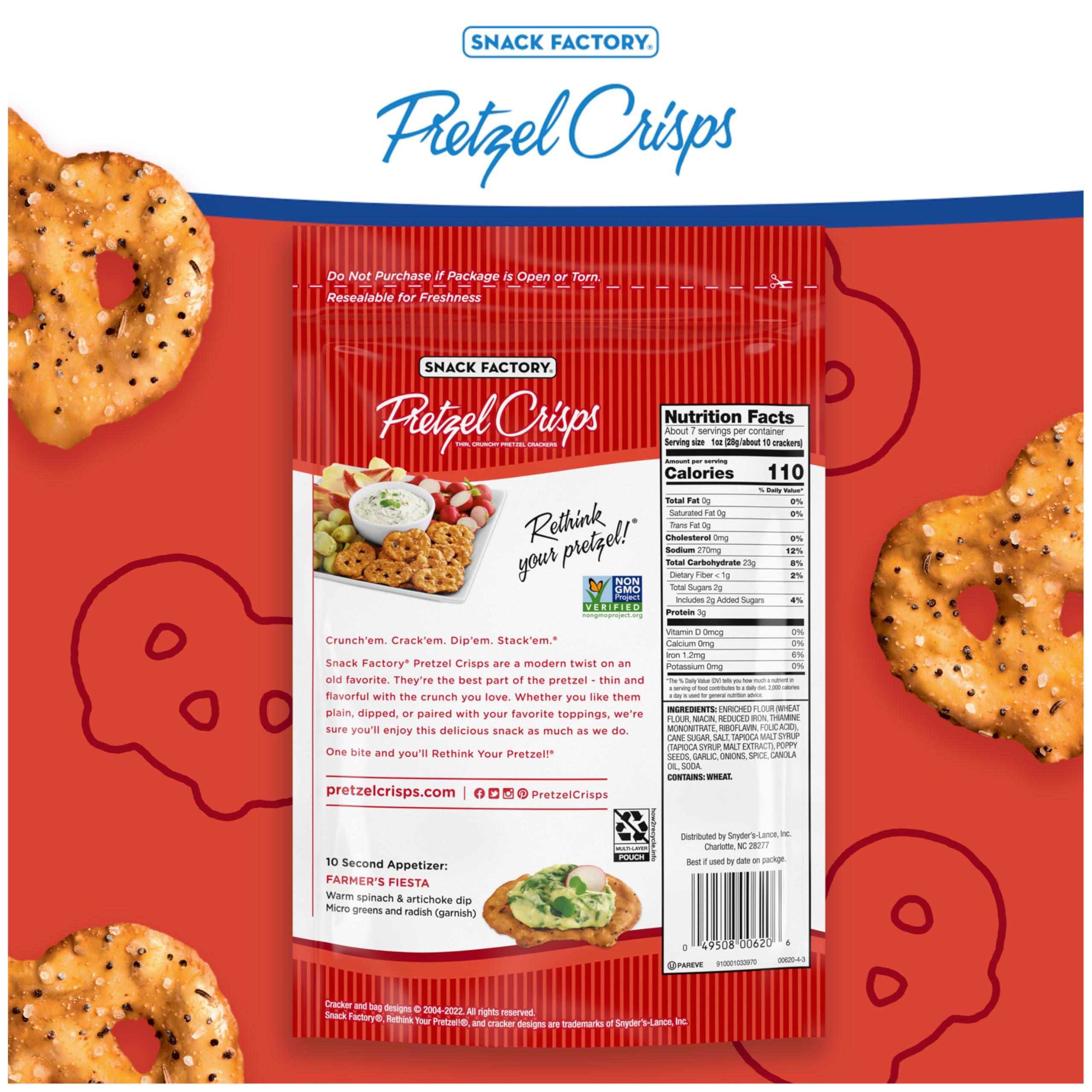 Dip or no dip, Snack Factory Everything Pretzel Crisps are flat-out delicious. Our Everything Pretzel Crisps are generously sprinkled with poppy seeds, onion, garlic and salt. A modern twist on a classic, these thin, crunchy pretzel chips give you the best part of traditional pretzels without the doughy center. They’re perfectly seasoned and baked just right for a satisfying crunch in a sturdy shape that's dippable, toppable and deliciously snackable. Snack Factory Everything pretzel thins are tasty on their own and they pair perfectly with hummus, cream cheese or any of your favorite dips. Top these thin pretzels with warm spinach and artichoke dip for an easy appetizer for your next party. Snack Factory Pretzel Crisps are made with quality ingredients and are Non-GMO Project Verified. This 7.2-ounce bag contains about 7 servings and is perfect for stashing in your pantry to satisfy your cravings for salty snacks. Since they’re so incredibly versatile, our pretzel crackers are also ideal for serving to guests. In addition to Everything, Snack Factory pretzel chips are available in other unique flavors such as Buffalo Wing, Garlic Parmesan and Everything.