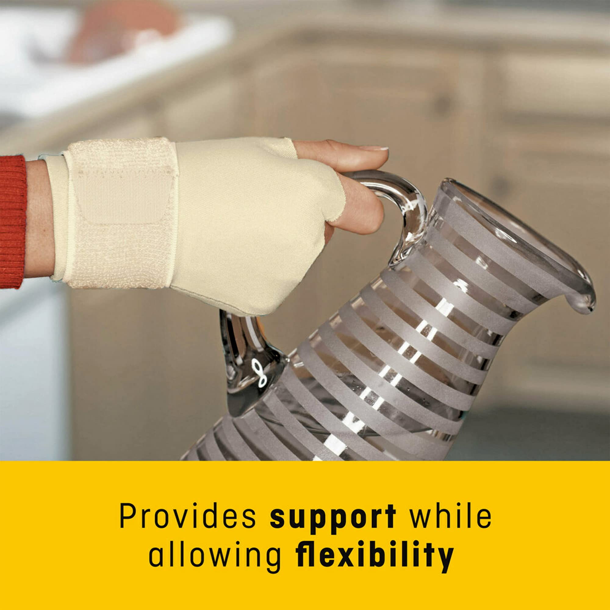 Breathable material. Adjustable wraparound strap for customized fit and support. Soft materials enhance comfort and provide flexibility. Ideal for everyday activities. To support stiff, weak or injured hand and wrist. 6.5-8.0 in (16.5-20.3 cm).