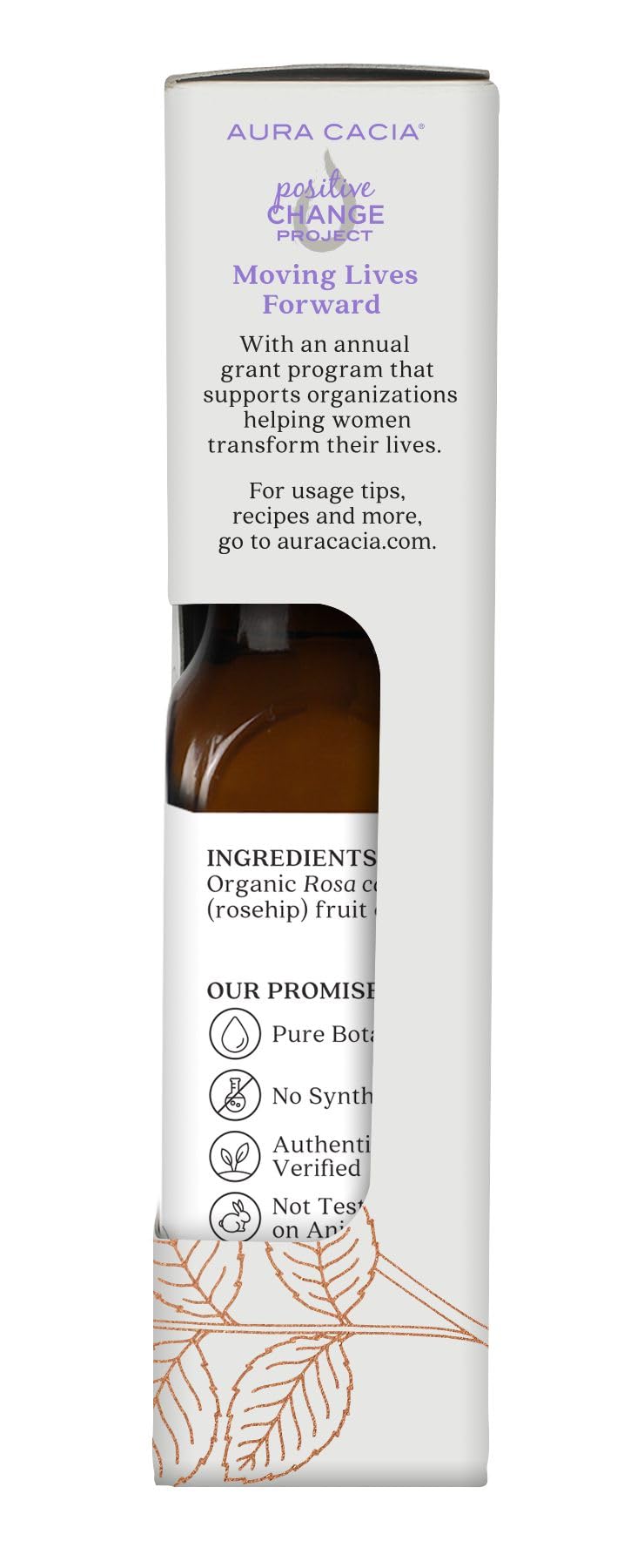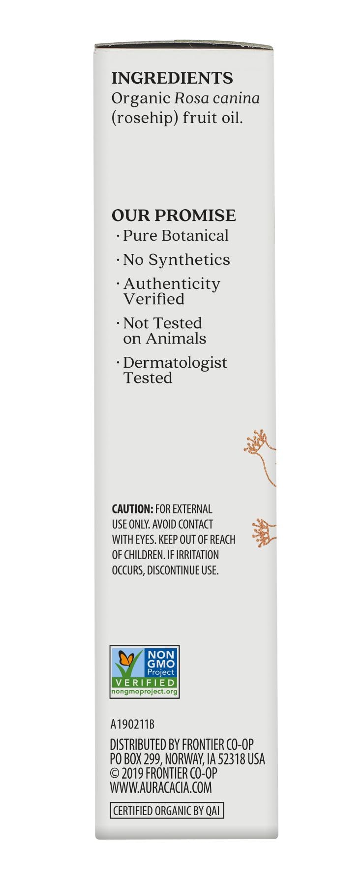 USDA Organic. Certified Organic by QAI. Non-GMO Project verified. nongmoproject.org. Absorption: Fast. Our Promise: Pure botanical. No synthetics. Authenticity verified. Dermatologist tested. www.auracacia.com. For usages tips, recipes and more go to auracacia.com. Positive Change Project: Moving lives forward. With an annual grant program that supports organizations helping women transform their lives. Not tested on animals.