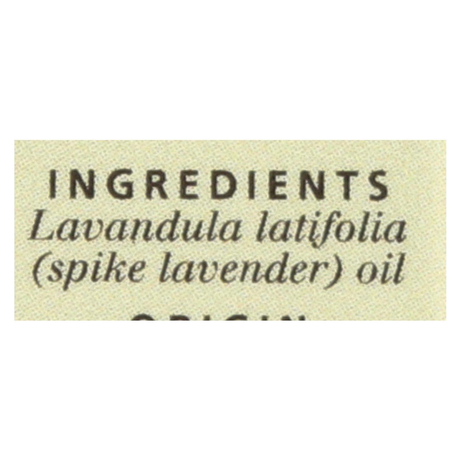 Safety: If pregnant, suffering from any medical condition, or taking medication, consult a health care practitioner before use. Dilute properly. May irritate skin Not for internal use. Keep out of reach of children. Ingredients: Lavandula latifolia (lavender spike) oil. Directions: Dilute properly. Origin: Spain. Size: 0.5 fl. oz. Package: Bottle. Botanical Name: Lavandula latifolia. Color: Colorless to pale yellow. Viscosity: Mobile.