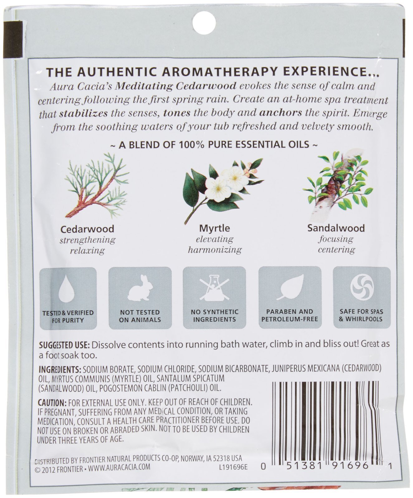 Pure aromatherapy. Essential nutrients for skin revival. Cool earth and rich cedarwood aroma. Aura Cacia blends mineral-rich ocean and desert salts with 100% pure essential oils. The result is a natural formula that lifts away old, dead cells, then softens and soothes while filling your senses with a new awareness. Unique blends of essential oils offer specific body, mind and spiritual benefits, helping you achieve a renewed sense of balance and well-being. You emerge from the tub refreshed and velvety-smooth. Body: Toning. Mind: Stabilizing. Spirit: Anchoring. 100% Pure essential oils. Not tested on animals. No synthetic fragrances, colors or preservatives. Paraben-free. Safe for whirlpools and spas.
