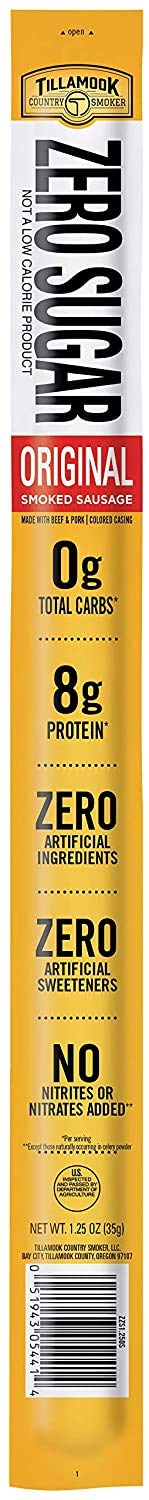 Tillamook 1.25oz zero sugar original Smoked sausages provide all the great taste of our Real hardwood smoked sausages, but without the sugar or carbs. They contain no artificial sweeteners, and are packed with 11g of protein per serving. Smoked sausage = meat stick. Whatever you call it, It's delicious. Tillamook zero sugar original Smoked sausages are a great snack anytime, whether you are at work or play; they're a great way to snack between meals. Tillamook is a six-year-old company based in bay City, Oregon U.S.A. Art crossley started making our perfectly smoked meats at his family butcher shop in the early '70s. As word spread, so did the Tillamook distribution. We now enjoy nationwide sales and are growing more Each day.
