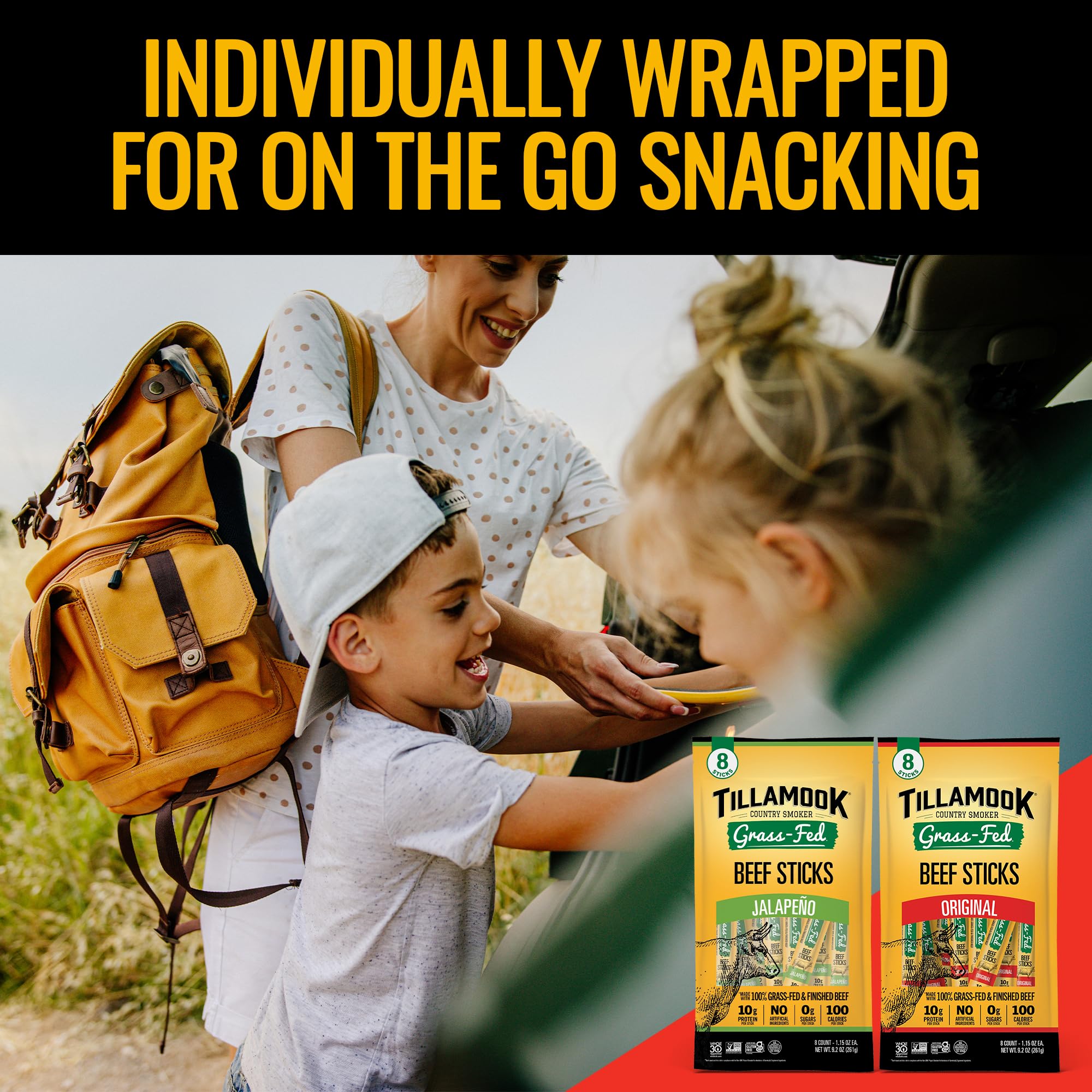 Tillamook Country Smoker Grass Fed Beef Sticks, Zero Sugar, Original, High Protein Keto Snack On-The-Go Tillamook Country Smoker Grass Fed Beef Sticks offer a clean, convenient snack made with 100% grass fed & finished beef—perfect for busy individuals and families on-the-go. Each gluten free beef stick is packed with 10g of protein, 0g of sugar, and only 100 calories, with no artificial ingredients. These handcrafted keto snacks are not only high in protein but also low in carbs, making them an ideal choice for anyone looking to fuel up while maintaining a healthy lifestyle. Non GMO project verified, Whole 30 approved, hormone and allergen free, Tillamook Beef Sticks are a great choice for a quick snack at work, during play, or between meals. Whether you're looking for a quick protein boost or a satisfying snack, these individually wrapped beef sticks provide a delicious and convenient option. Proudly smoked in Tillamook County, Oregon, since 1975, using simple, pronounceable ingredients, our family recipes have been honed over decades to bring you snacks that taste better because they’re made better. Enjoy a mouthwatering flavor the whole family will love.