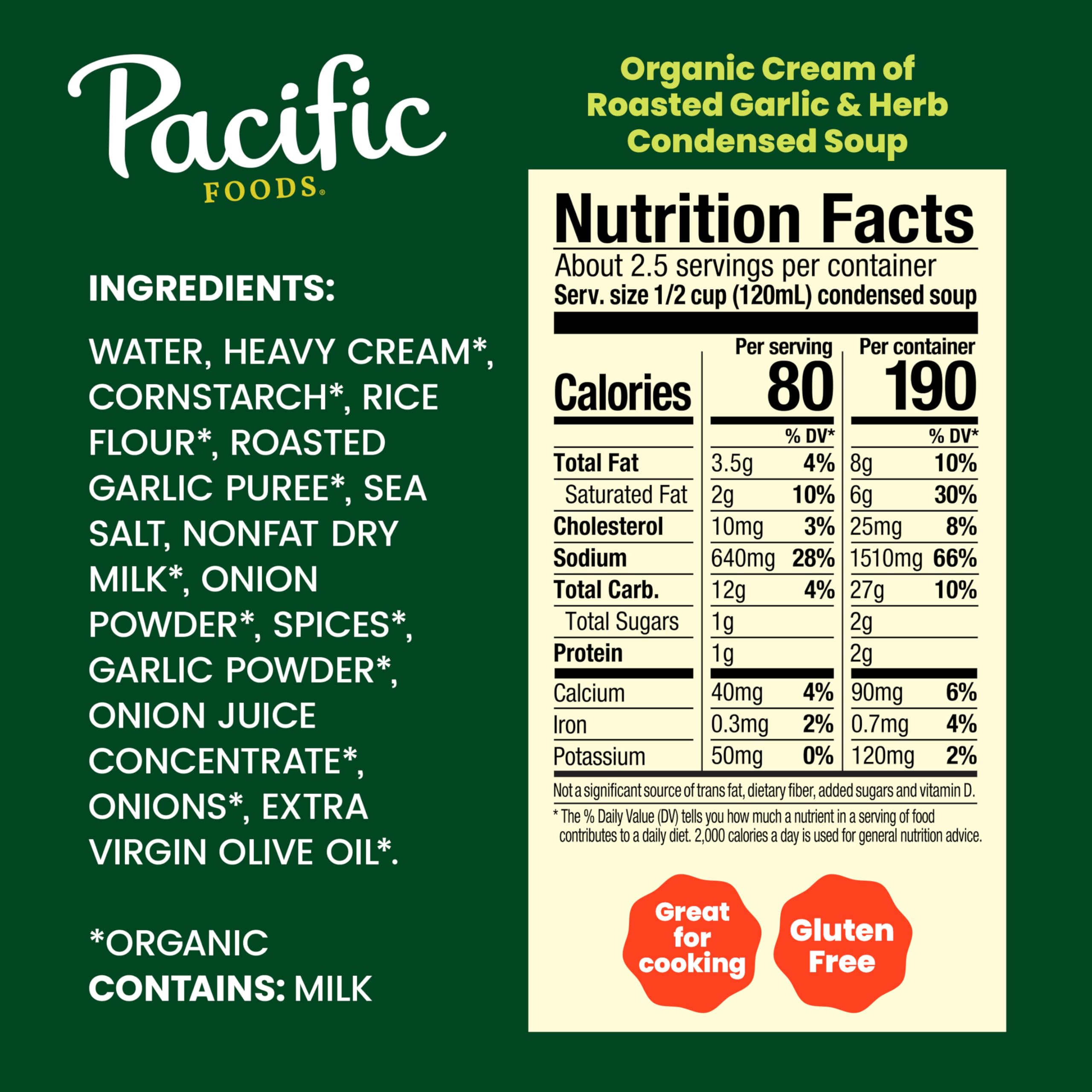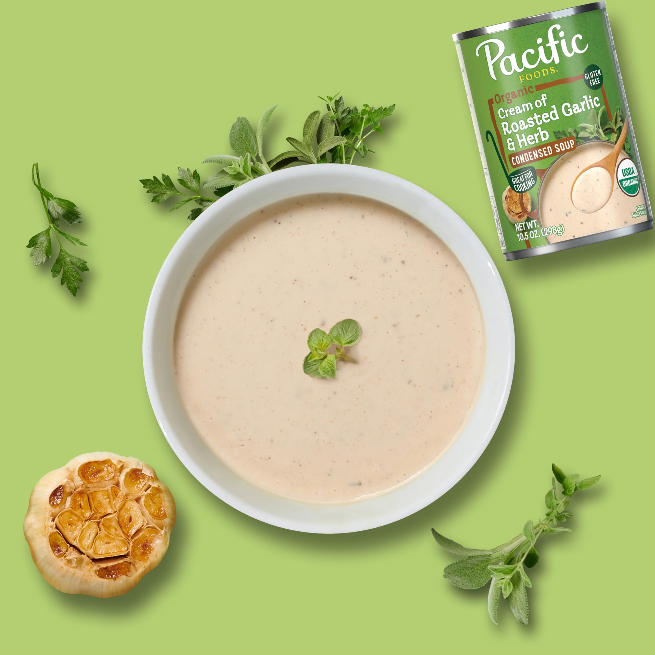 Effortlessly craft extraordinary meals with Pacific Foods Organic Condensed Cream of Roasted Garlic and Herb Soup. This vegetarian soup is made with a savory blend of roasted garlic, herbs and cream for a rich, smooth flavor. Use it as an ingredient in recipes like Garlic and Herb White Bean Dip, or substitute it for roux or bechamel as a sauce starter. Pacific Foods canned soup is an elevated pantry staple and a must-have for creating something quick and easy. Made with non-GMO ingredients, our USDA-certified organic soup contains no added sugars or artificial flavors. Itβs also a gluten free soup that can be enjoyed on its own, customized with your favorite toppings, or paired with a salad. Simply mix the condensed soup with 1 can of milk and microwave on high for 2.5 to 3 minutes in a covered microwave-safe bowl, or heat in a saucepan on the stove, stirring occasionally. Each 10.5 oz recyclable can contains about 2.5 servings of microwave soup. In addition to Cream of Roasted Garlic and Herb, Pacific Foods offers Cream of Mushroom, Cream of Chicken, and more. At Pacific Foods, we're dedicated to making the most nourishing foods possible from simple, carefully sourced ingredients.