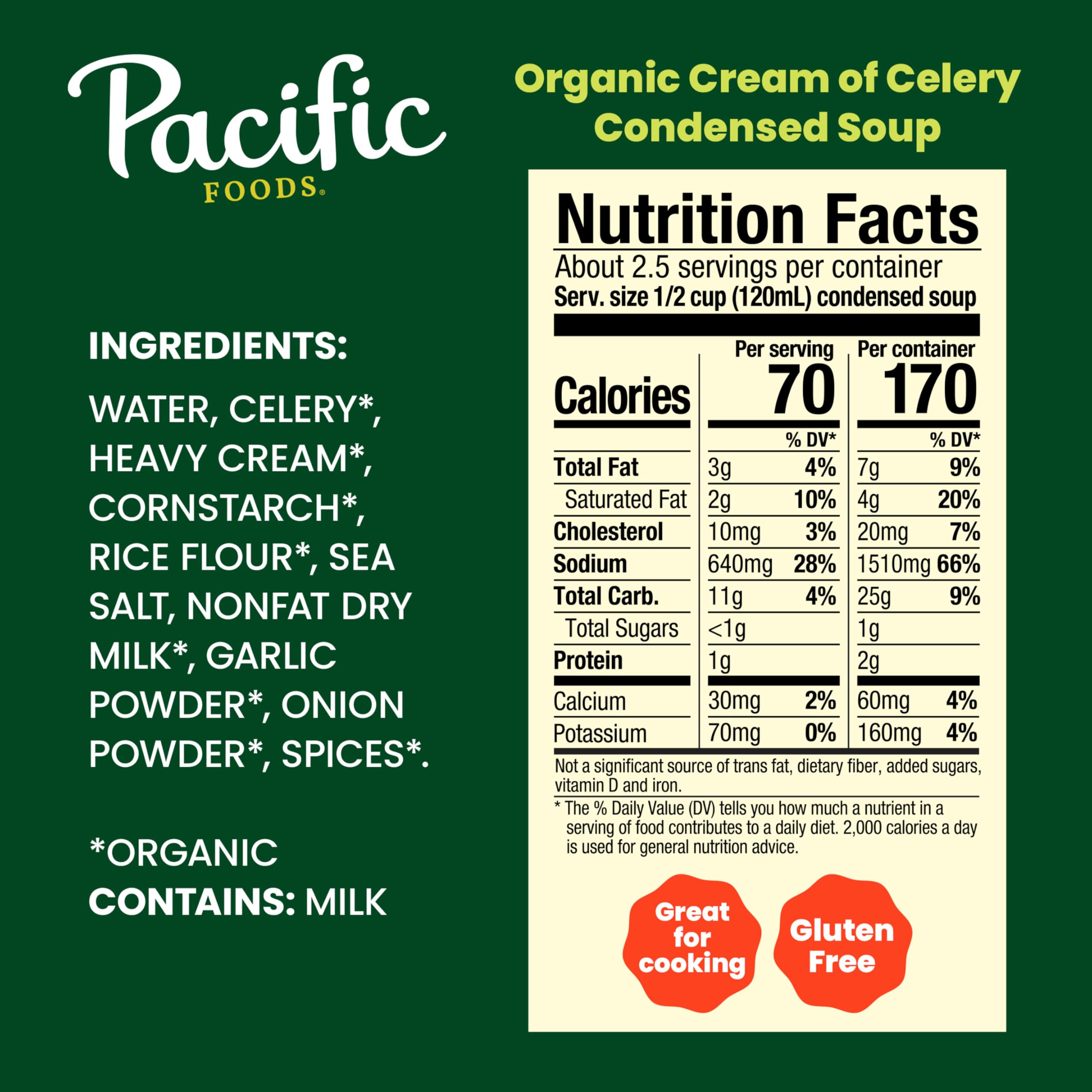 Effortlessly craft extraordinary meals with Pacific Foods Organic Condensed Cream of Celery Soup. This vegetarian soup is made with a savory blend of celery and cream for a rich, smooth flavor. Use it as an ingredient in recipes like Crispy Buffalo Chicken Tacos, or substitute it for roux or bechamel as a sauce starter. Pacific Foods canned soup is an elevated pantry staple and a must-have for creating something quick and easy. Made with non-GMO ingredients, our USDA-certified organic soup contains no added sugars or artificial flavors. Itβs also a gluten free soup that can be enjoyed on its own, customized with your favorite toppings, or paired with a salad. Simply mix the condensed soup with 1 can of milk and microwave on high for 2.5 to 3 minutes in a covered microwave-safe bowl, or heat in a saucepan on the stove, stirring occasionally. Each 10.5 oz recyclable can contains about 2.5 servings of microwave soup. In addition to Cream of Celery, Pacific Foods offers Cream of Mushroom, Cream of Chicken, and more. At Pacific Foods, we're dedicated to making the most nourishing foods possible from simple, carefully sourced ingredients.