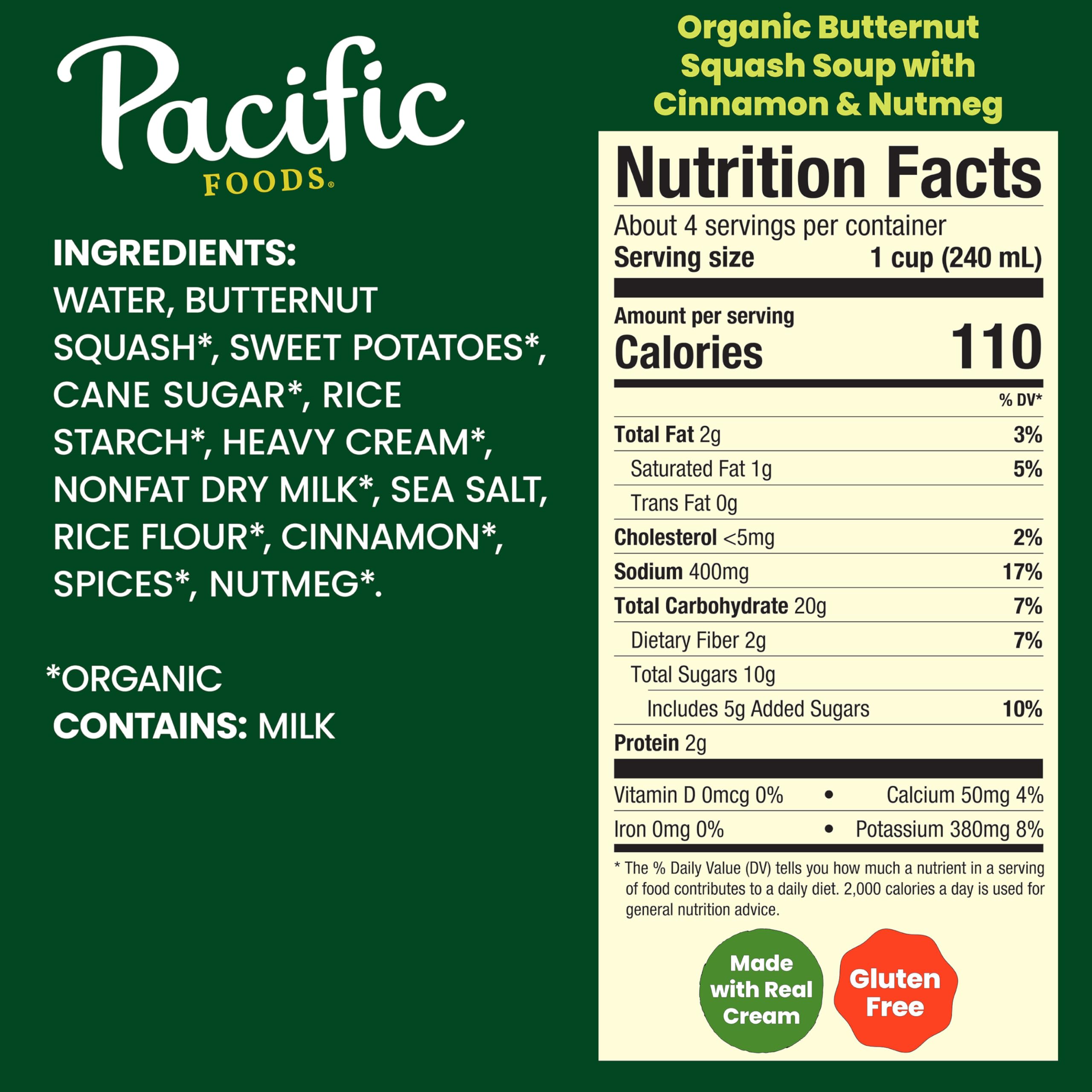 Immerse your taste buds into something truly unique with Pacific Foods Organic Butternut Squash Soup With Cinnamon and Nutmeg. Sweet and savory, this USDA Organic soup is consciously crafted with non-GMO ingredients, including fall-harvested butternut squash and real cream. Cinnamon and nutmeg enhance the natural sweetness with a touch of spice, creating a creamy vegetarian soup that’s full of autumn-inspired flavor. Free from high fructose corn syrup and artificial colors, this gluten free soup makes it easy to be intentional about the way you stock your pantry. Enjoy it on its own as a quick and easy vegetarian snack, customize it with your favorite toppings, or pair it with a salad, sandwich or wrap. You can also use it to create flavorful sauces or as a base for your favorite side dish. To prepare, simply pour, heat until hot, stir and enjoy. Each 32 oz resealable carton contains about 4 servings. In addition to Butternut Squash With Cinnamon and Nutmeg, Pacific Foods offers Creamy Tomato, Cashew Carrot Ginger, and more. At Pacific Foods, we're dedicated to making the most nourishing foods possible from simple, carefully sourced ingredients.