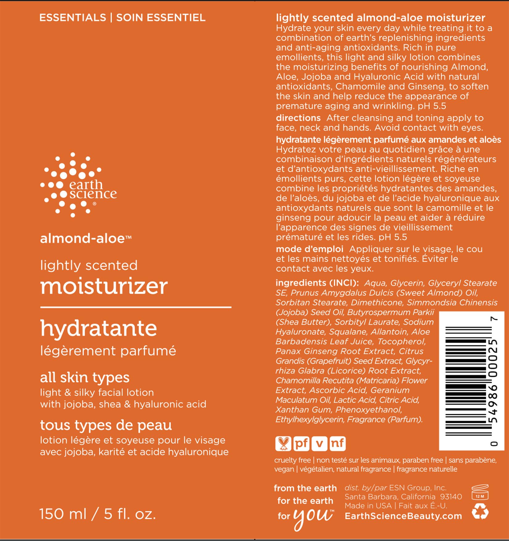 Vegan. All skin types. Light & silky facial lotion with jojoba, shea & hyaluronic acid. Lightly scented almond-aloe moisturizer. Hydrate your skin every day while treating it to a combination of earth's replenishing ingredients and anti-aging antioxidants. Rich in pure emollients, this light and silky lotion combines the moisturizing benefits of nourishing almond aloe, jojoba and hyaluronic acid with natural antioxidants, chamomile and ginseng, to soften the skin and help reduce the appearance of premature aging and wrinkling. pH 5.5. Paraben free. Natural fragrance. From the earth, for the earth, for you. EarthScienceBeauty.com. Made in USA.