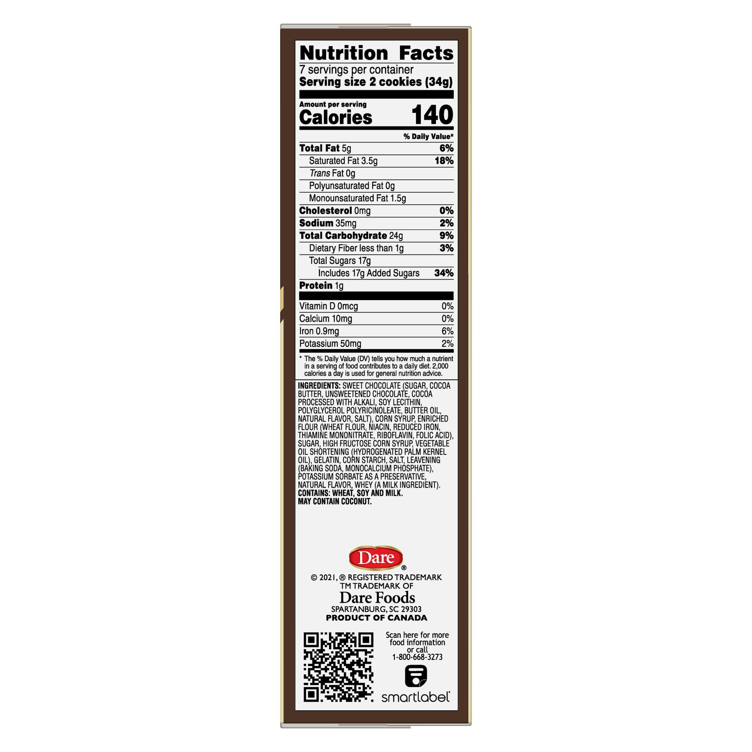 Whether enjoying these treats on your own or with your family and friends, everyone will love the pure, chocolate and heavenly cloud-like marshmallow contained in every bite of Dare Whippet Cookies. These irresistible chocolate treats have zero grams of trans fat making them a sinfully delectable delight without all the unnecessary guilt. These cookies have been Quebec’s favorite since 1927 because of their delicious chocolate coating and satisfying flavor. Made in a peanut-free facility, Dare Whippet cookies are perfect to serve as an after school treat, after dinner dessert, or anytime you find yourself longing for something to fulfill your chocolate craving. Made with cocoa butter, chocolate liquor, and wheat flour, Dare Whippet cookies are full of delicious ingredients and smothered in a pure dark chocolate for a taste that is sure to satisfy your every desire.
