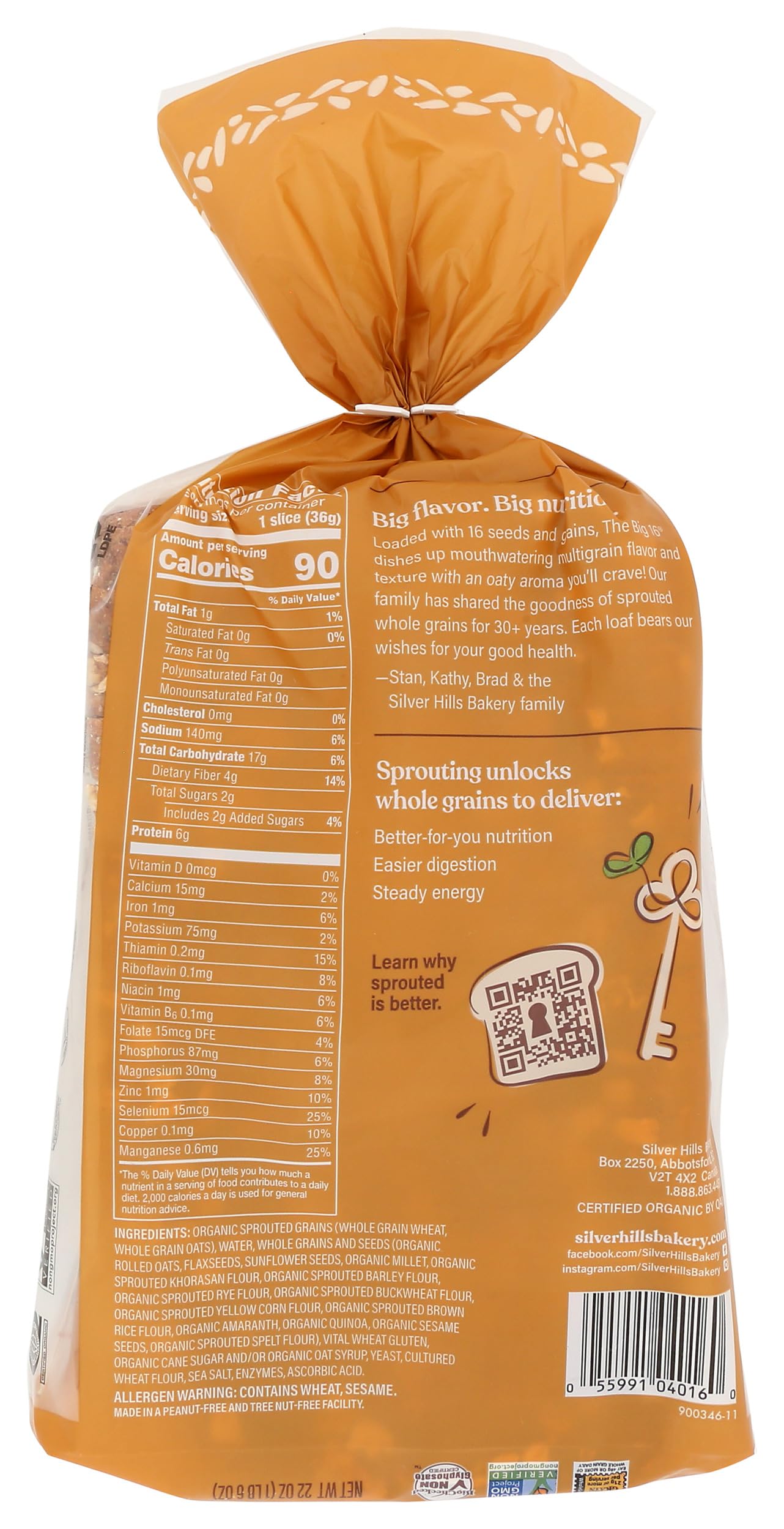 Silver hills the big 16 sprouted wheat bread fuels your days with 16 seeds and grains in an organic bread ideal for sandwiches, toast and other snacks. The sprouted whole grains provide essential nutrients, and the bread is a good source of fiber for your diet. This 22 ounce loaf of vegan bread is free of dairy and contains 16 servings, with 23 g of whole grains per slice.