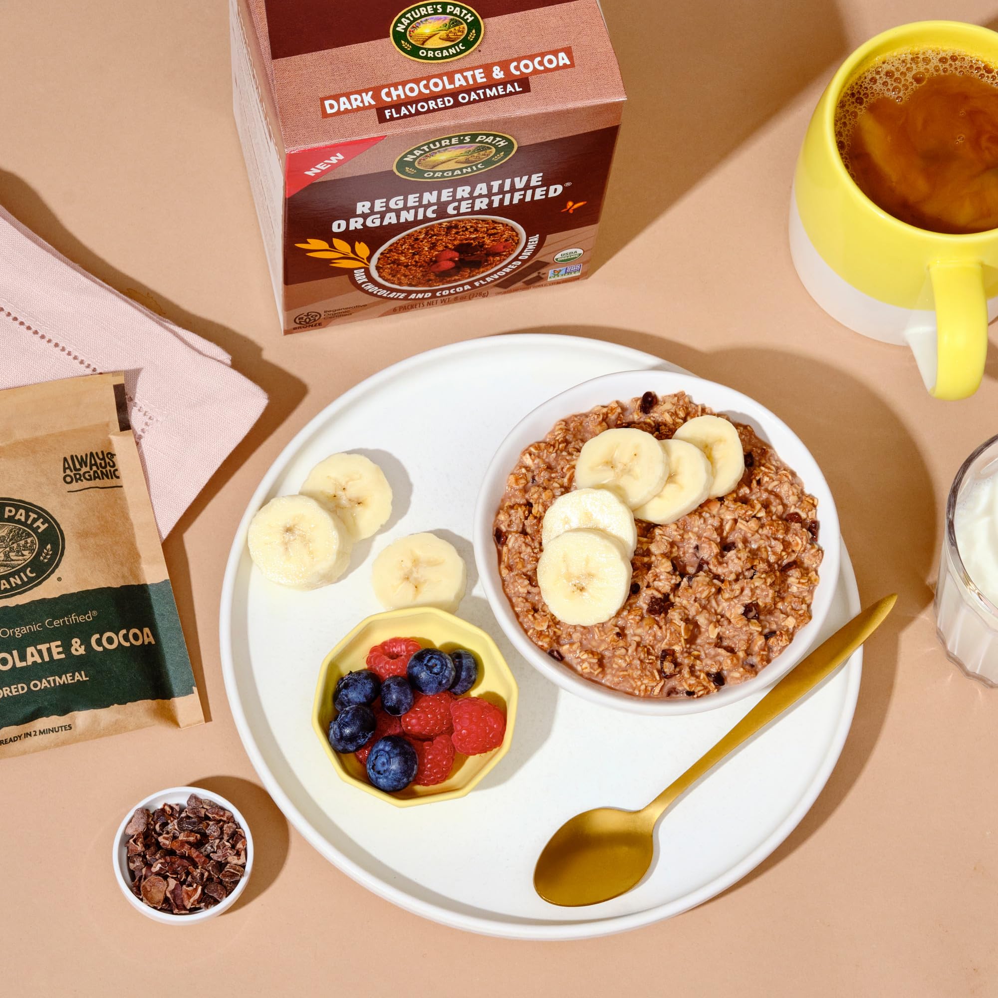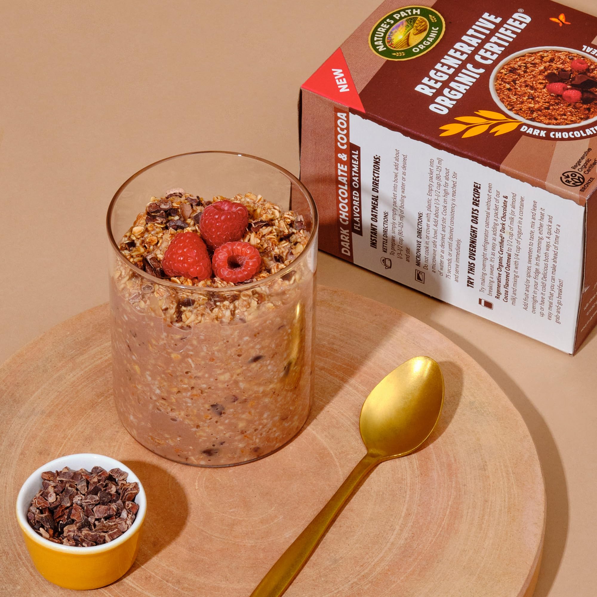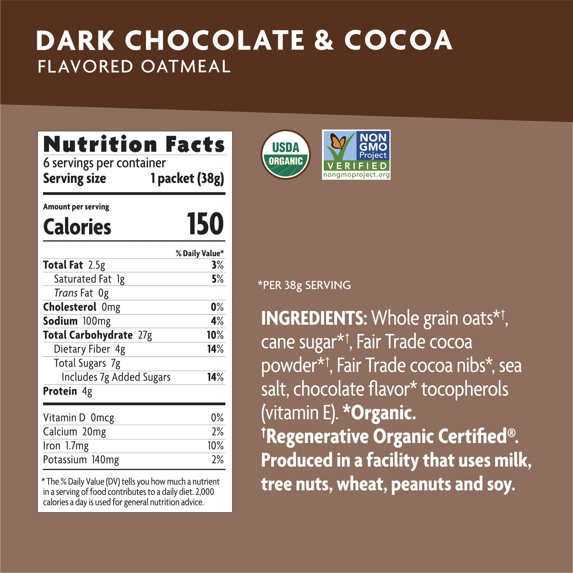 6 single-serve packets of quick cooking Regenerative Organic Certified ® whole grain oats, sprinkled with Fair Trade cocoa nibs for a pinch of dark chocolate sweetness! We believe it’s important to start the day right, and that’s why we created this deliciously tasty oatmeal, filled with simple, whole food, organic and Non-GMO ingredients.