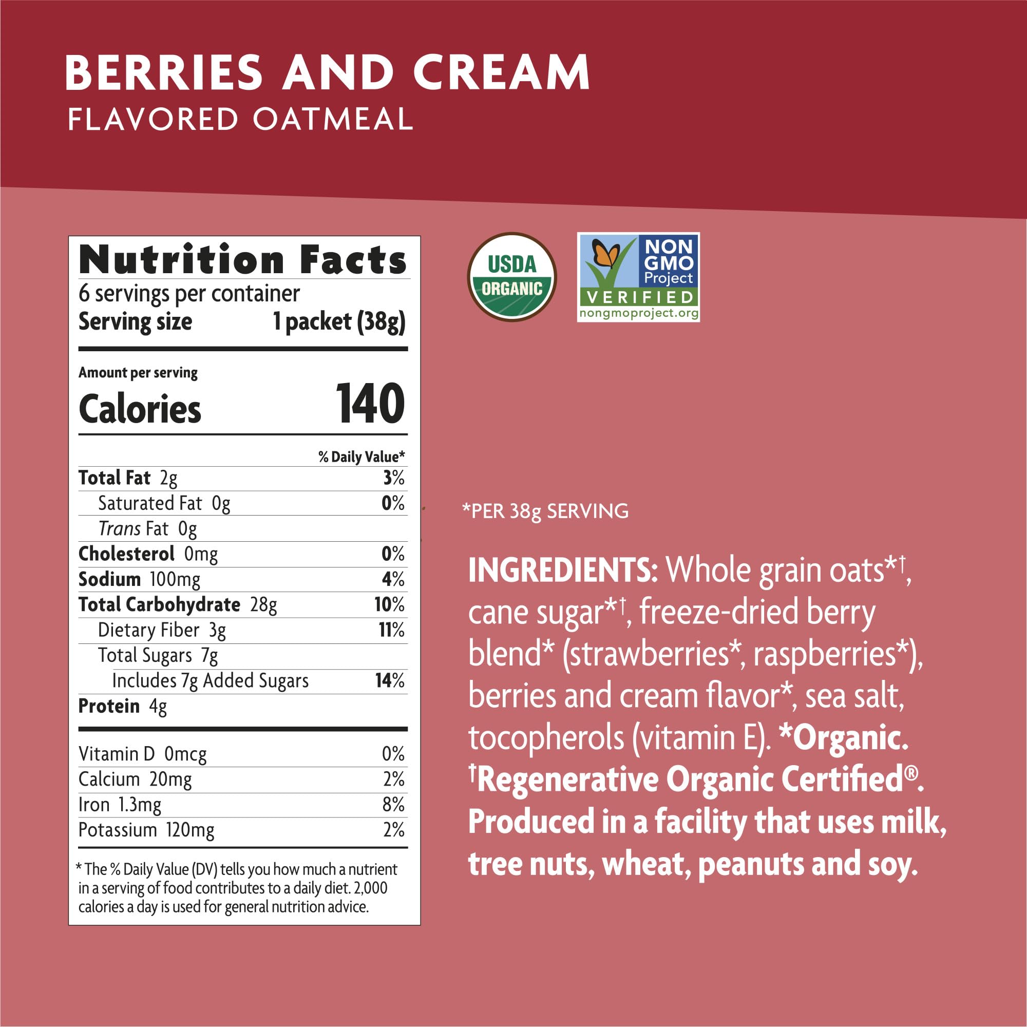 6 single-serve packets of quick cooking Regenerative Organic Certified® whole grain oats, filled with a blend of freeze-dried berries to give you that healthy, nutritious, burst of berry goodness! We believe it’s important to start the day right, and that’s why we created this deliciously tasty oatmeal, filled with simple, whole food, organic and Non-GMO ingredients.