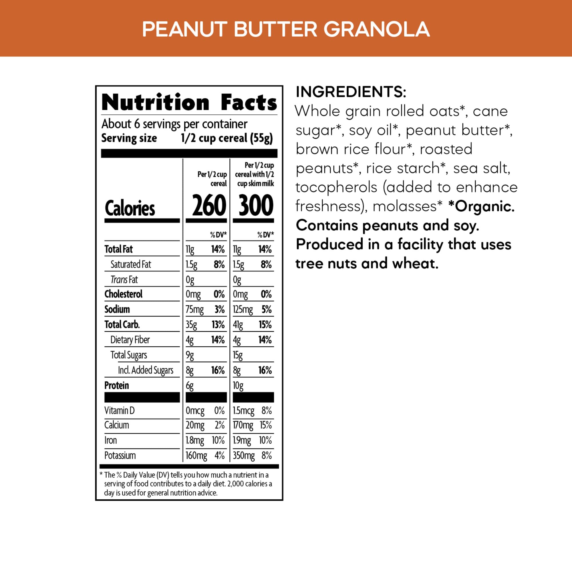 Snacking just got better – and healthier with Nature’s Path Peanut Butter Granola. Each serving fuels your body with 30g of whole grains, 4g of fiber so that you can keep up with your busy schedule and enjoy the pleasures of healthy eating. Top your favorite desserts with this delicious granola that delivers a hearty crunch or grab a handful while on your way to work, school or the gym. The blend of whole grain rolled oats, roasted peanuts and organic peanut butter is impossible to resist.
