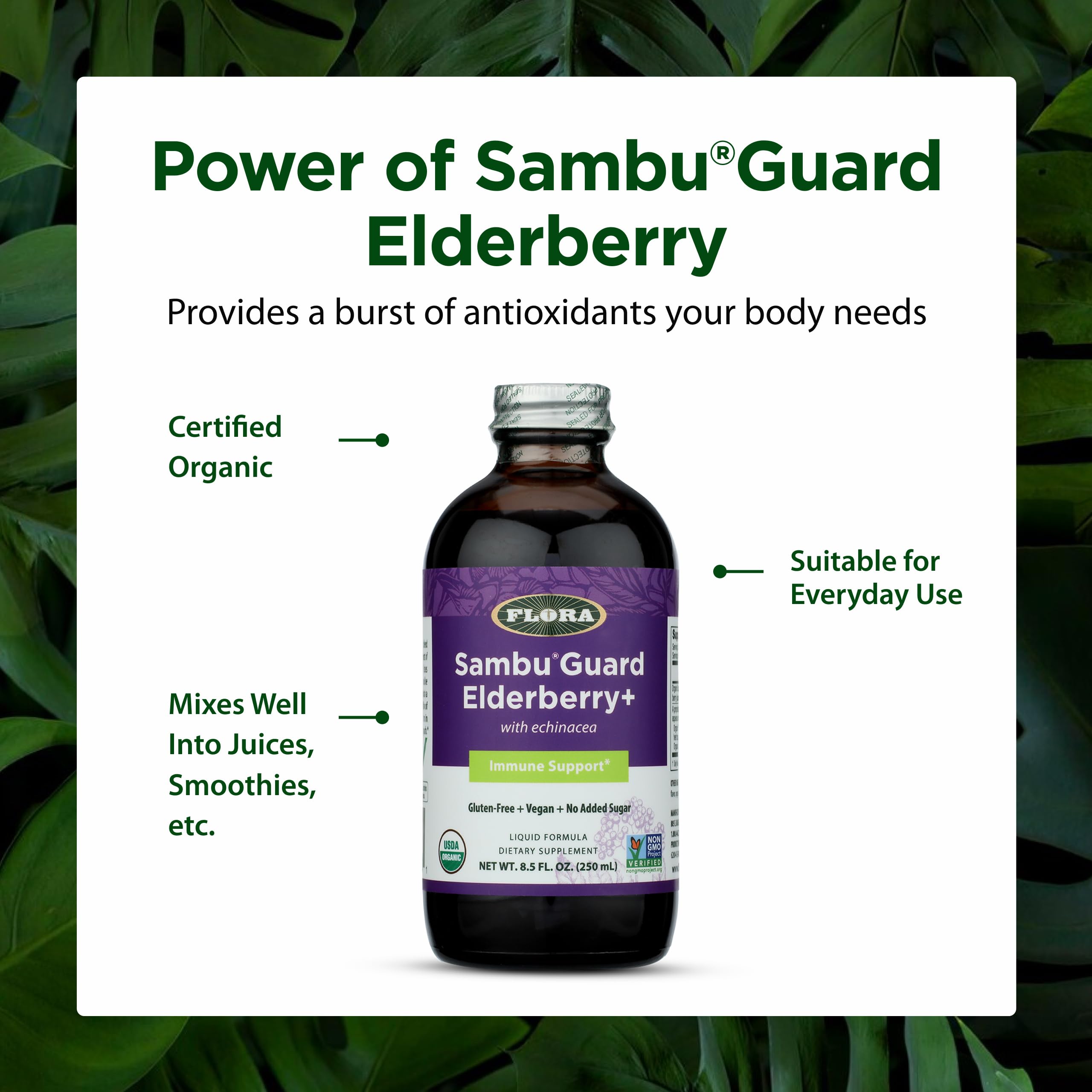 Flora Organic Black Elderberry Syrup + 8.5oz - Immune Booster with Echinacea, for Kids & Adults, No Added Sugar, Gluten Free, Vegan, SambuGuard