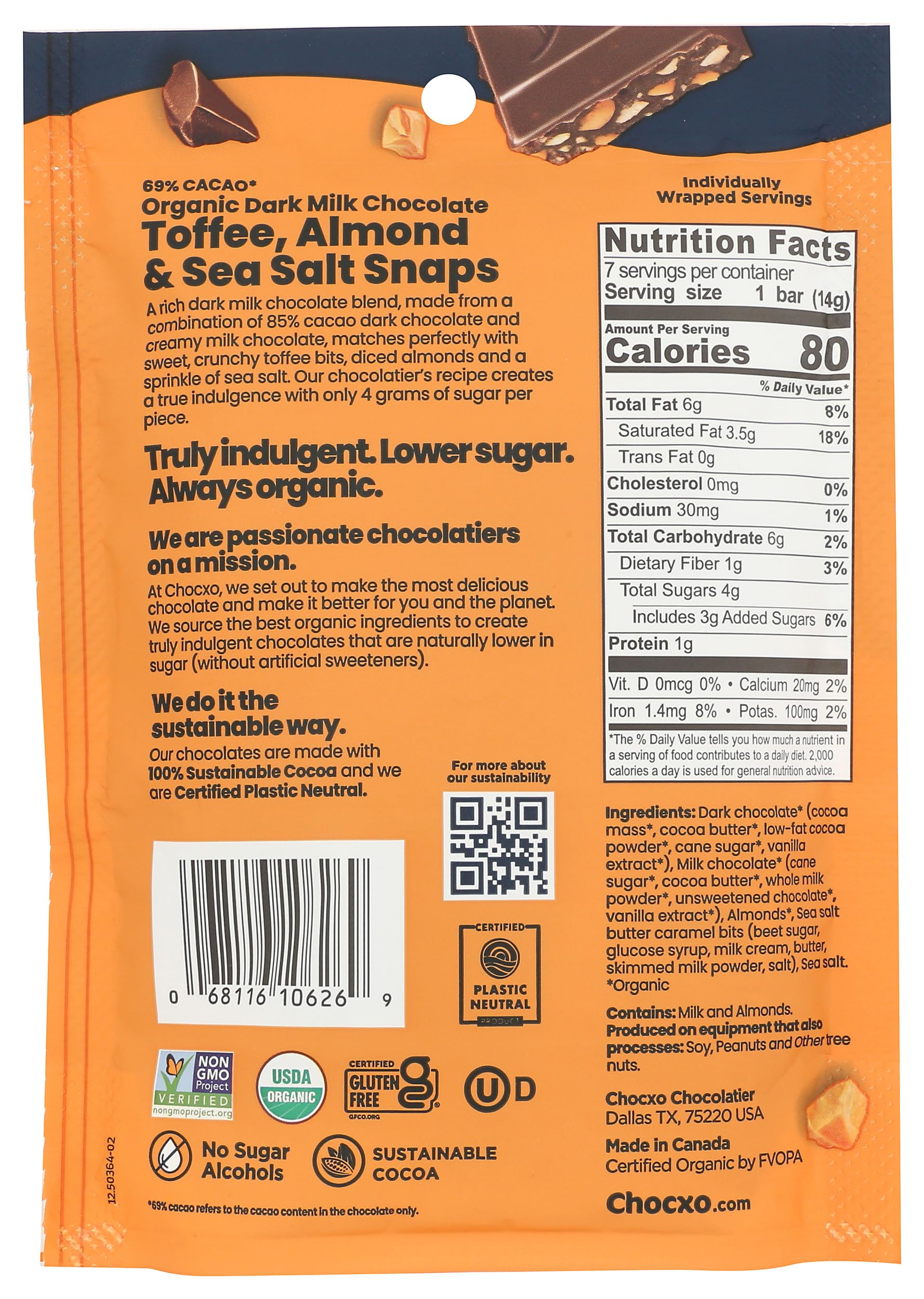 CHOCXO 69% Dark Milk Organic Toffee, Almond & Sea Salt Snap | 14g x 7/SUP | 6 SUP/cs