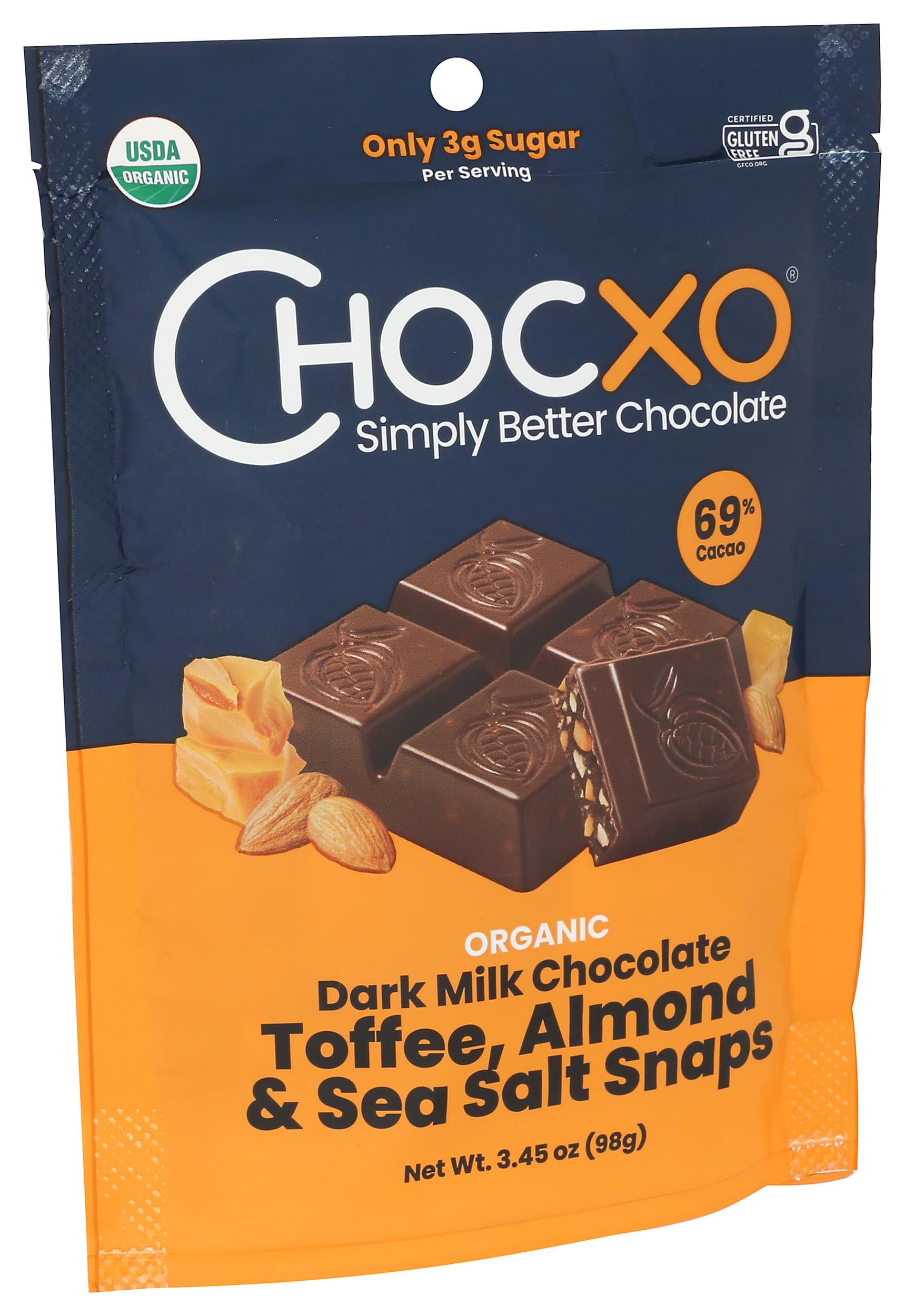 Chocxo Snaps Chocolate Dark Milk Toffee Almond 69% Organic 3.45 Ounce