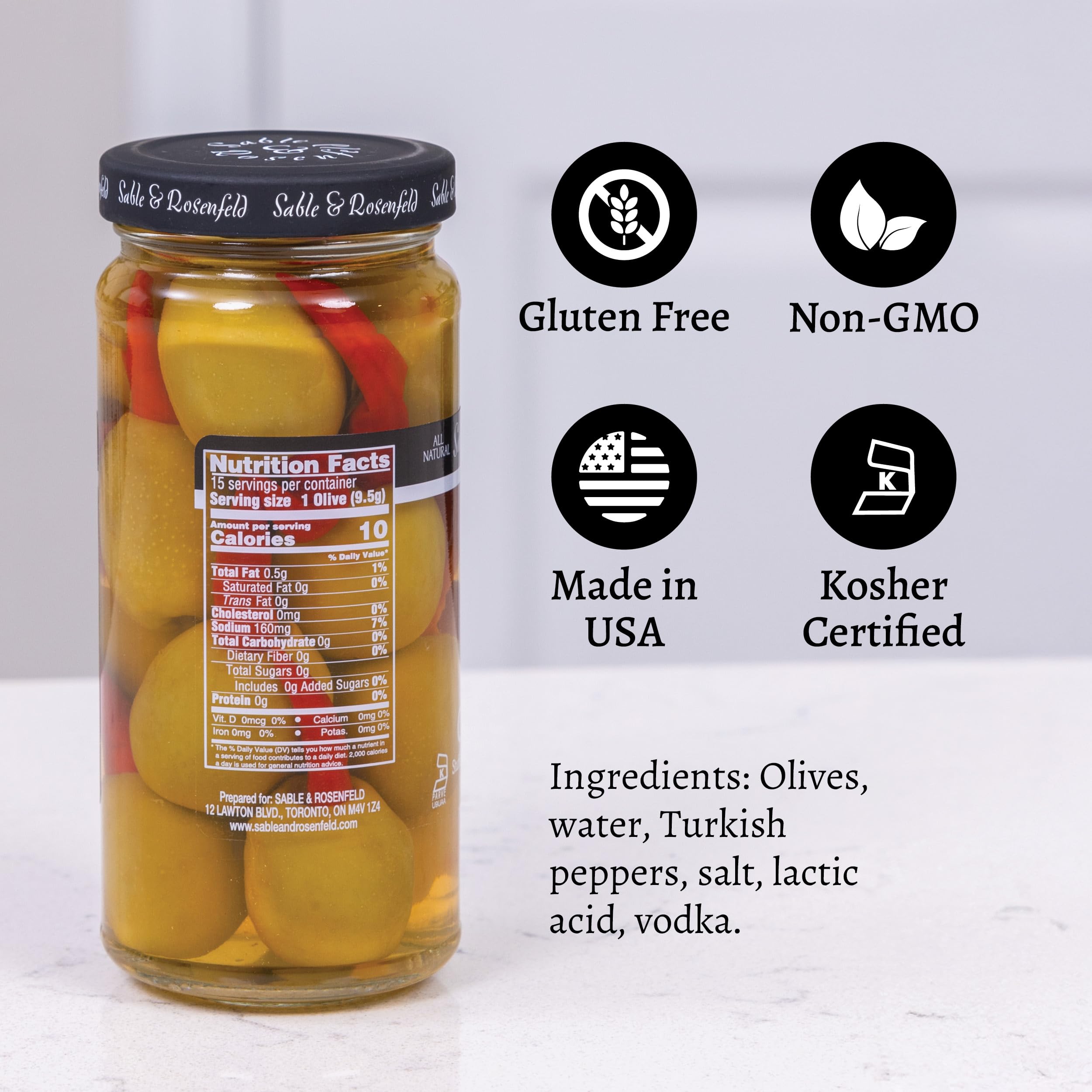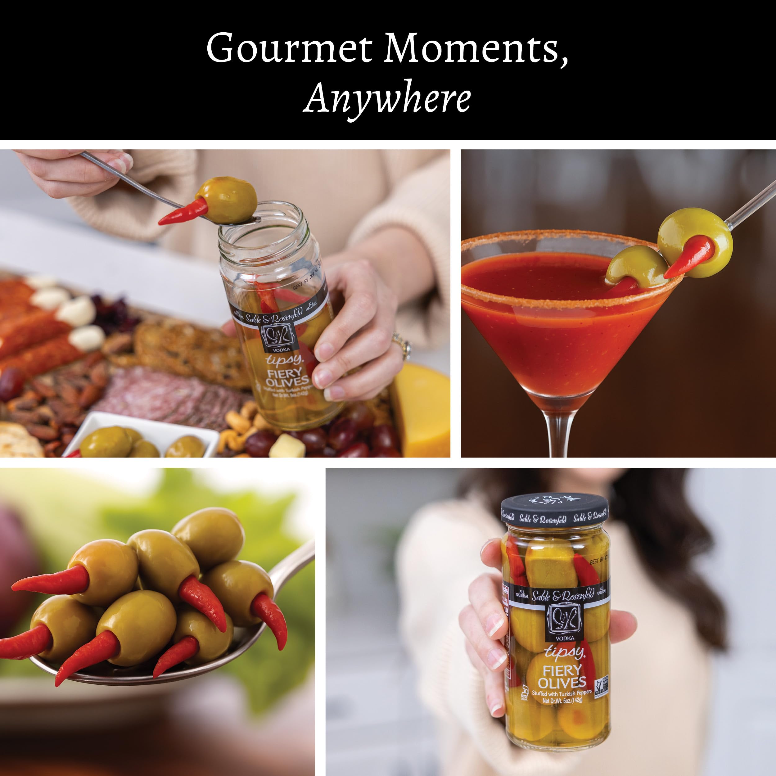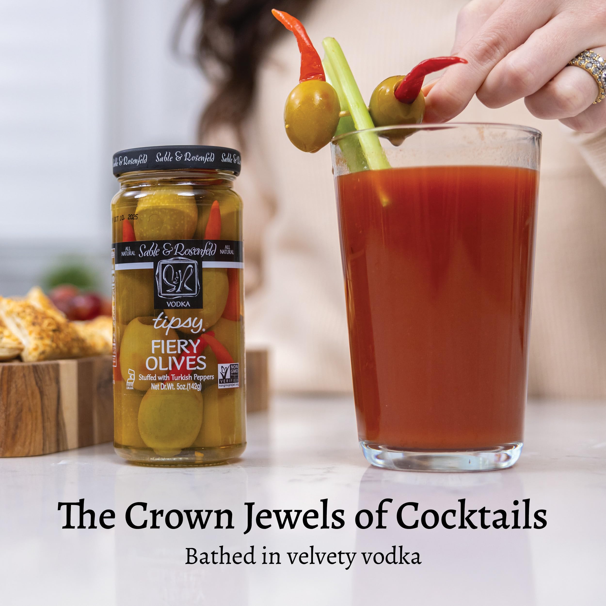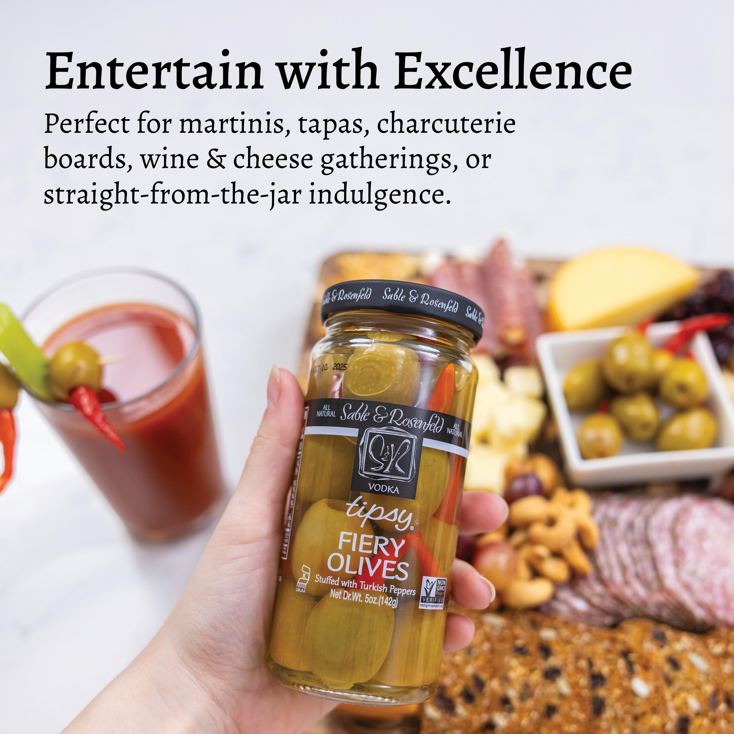 Sable & Rosenfeld Vodka Tipsy Fiery Olives 5 oz Jar (Pack of 6), Green Olives Stuffed with Turkish Peppers, Kosher, Gluten-Free Cocktail Garnish