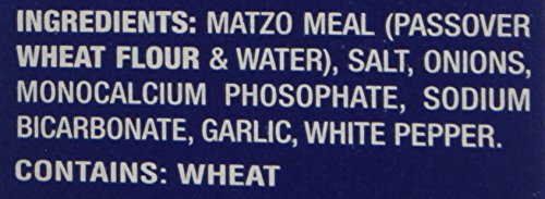 Product of USA. Pack of 3. Kosher for Passover. Produced under strict Rabbinical supervision, in the factory our great-grandfather founded in New York's Historic Lower East Side neighborhood. Contains: Wheat. Ingredinets: Matzo Meal (Passover Wheat Flour & Water), Tapioca Dextrose, Salt, Onions, Olive Oil, Garlic, Monocalcium Phosphate, Sodium Bicarbonate, White Pepper, Celery Seed, Dill Seed, Parsley, Turmeric.