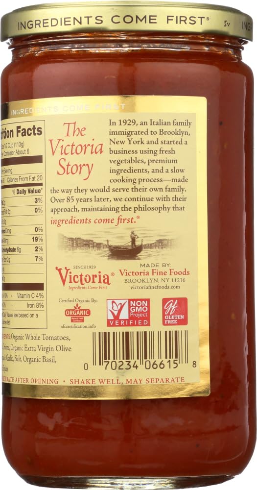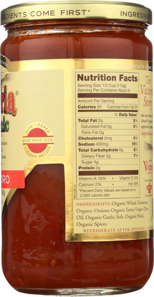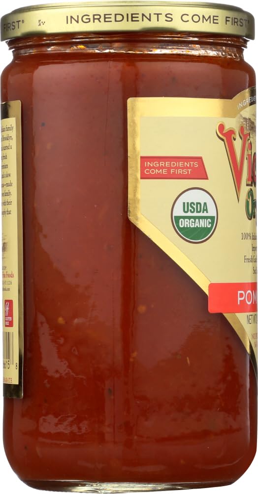 Victoria fine foods pomodoro organic sauce is prepared with imported italian tomatoes fresh onion fresh garlic fresh basil and italian olive oil all slow cooked to perfection. All natural without any tomato paste or fillers added. Usda and natural food certifiers officially organic. See nutrition fact panel for allergens. Includes one 24 oz. Jar of victoria fine foods pomodoro organic sauce. We use only a handful of fresh wholesome ingredients without added sugar water or preservatives. And we were among the first to put our ingredients on the front of our label hence our tagline: ingredients come first.country of origin : united statesis gluten free : yesis gmo free : yesis kosher : yesorganic : 95%+ organicsize : 24 ozpack of : 6selling unit : caseingredients : organic whole tomatoes;organic onions;organic extra virgin olive oil;organic garlic;salt;organic basil;organic spiceskeywords : gravy;italian;pasta;red;spaghetti;tomato