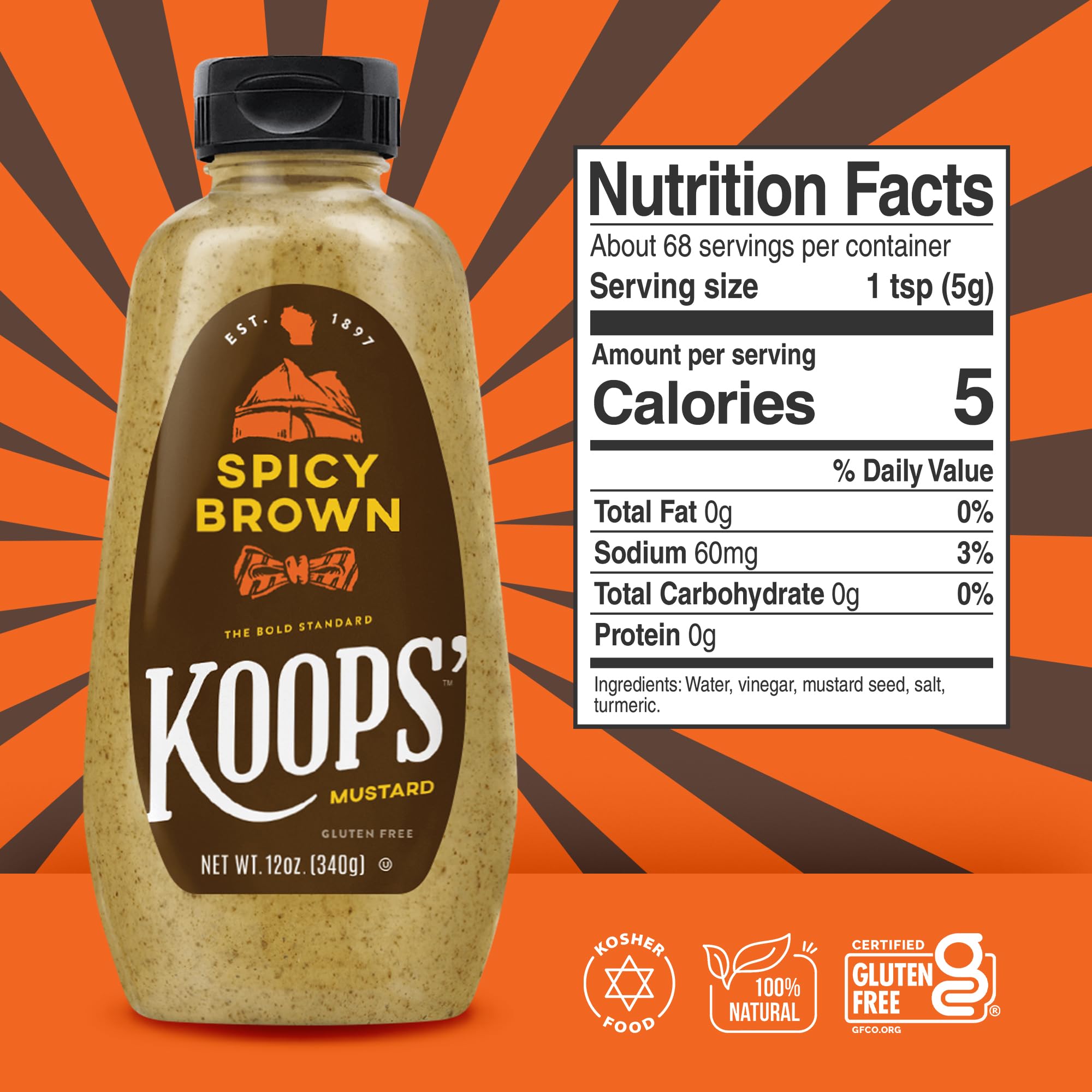 Koops' Spicy Brown Mustard – Spicy Mustard, Gluten-Free, Kosher, Made in USA, From Quality Mustard Seeds, Delicious and Bold Flavor – 12 Oz, Pack of 1
