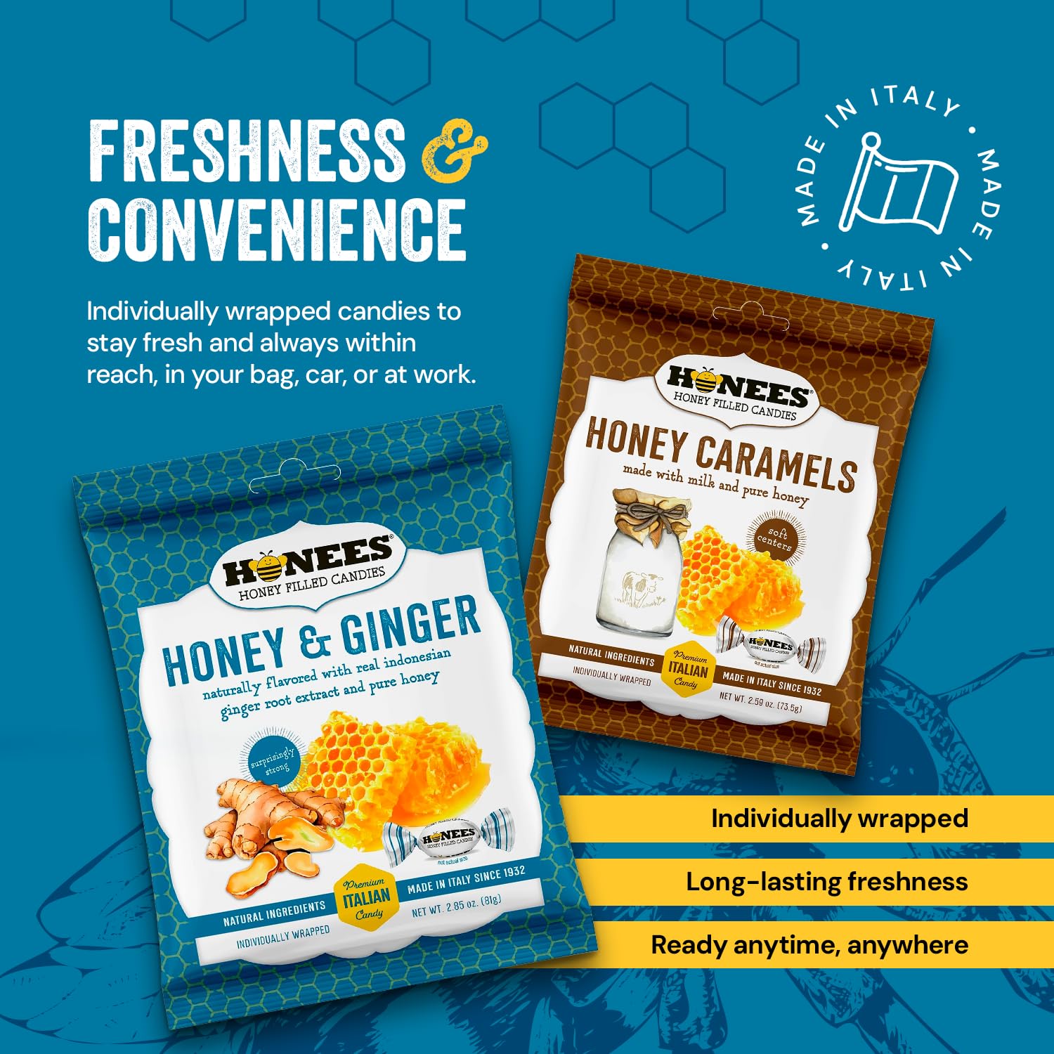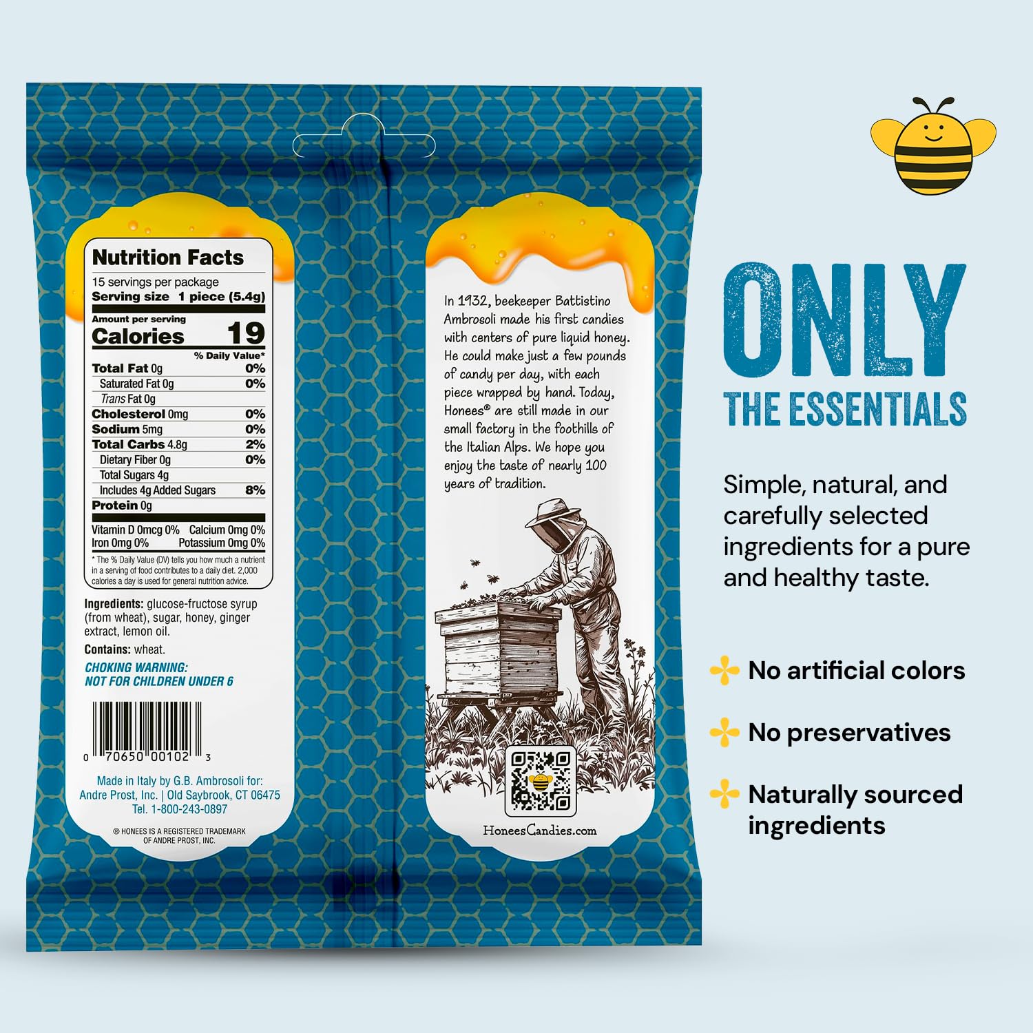 Honees Honey & Ginger Hard Candy Individually Wrapped | Natural & Healthy Candy, Italian Made with Real Honey & Indonesian Ginger, 1 Pack (2.85 oz)