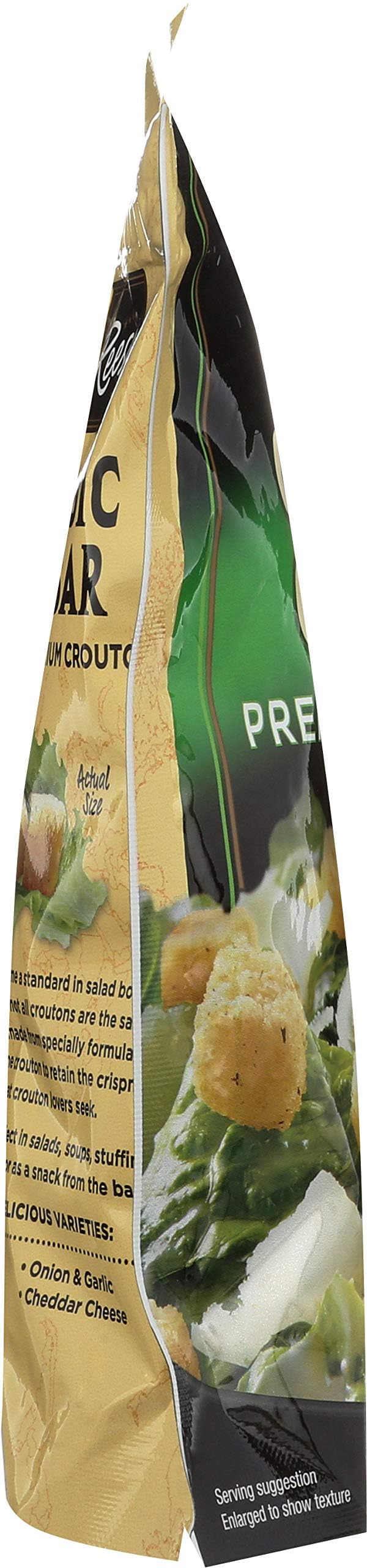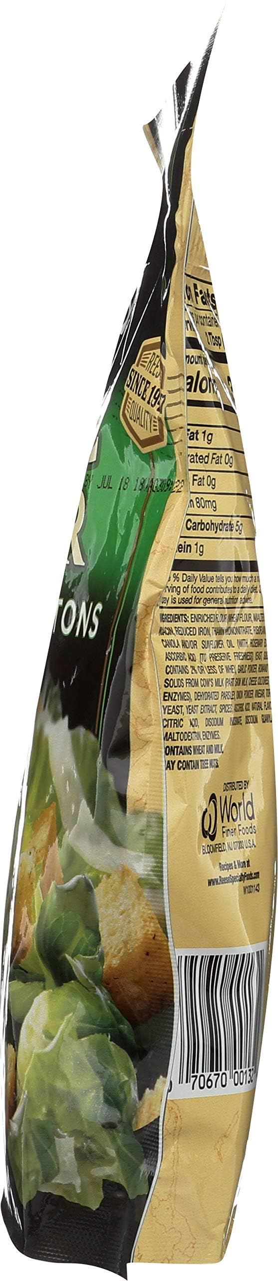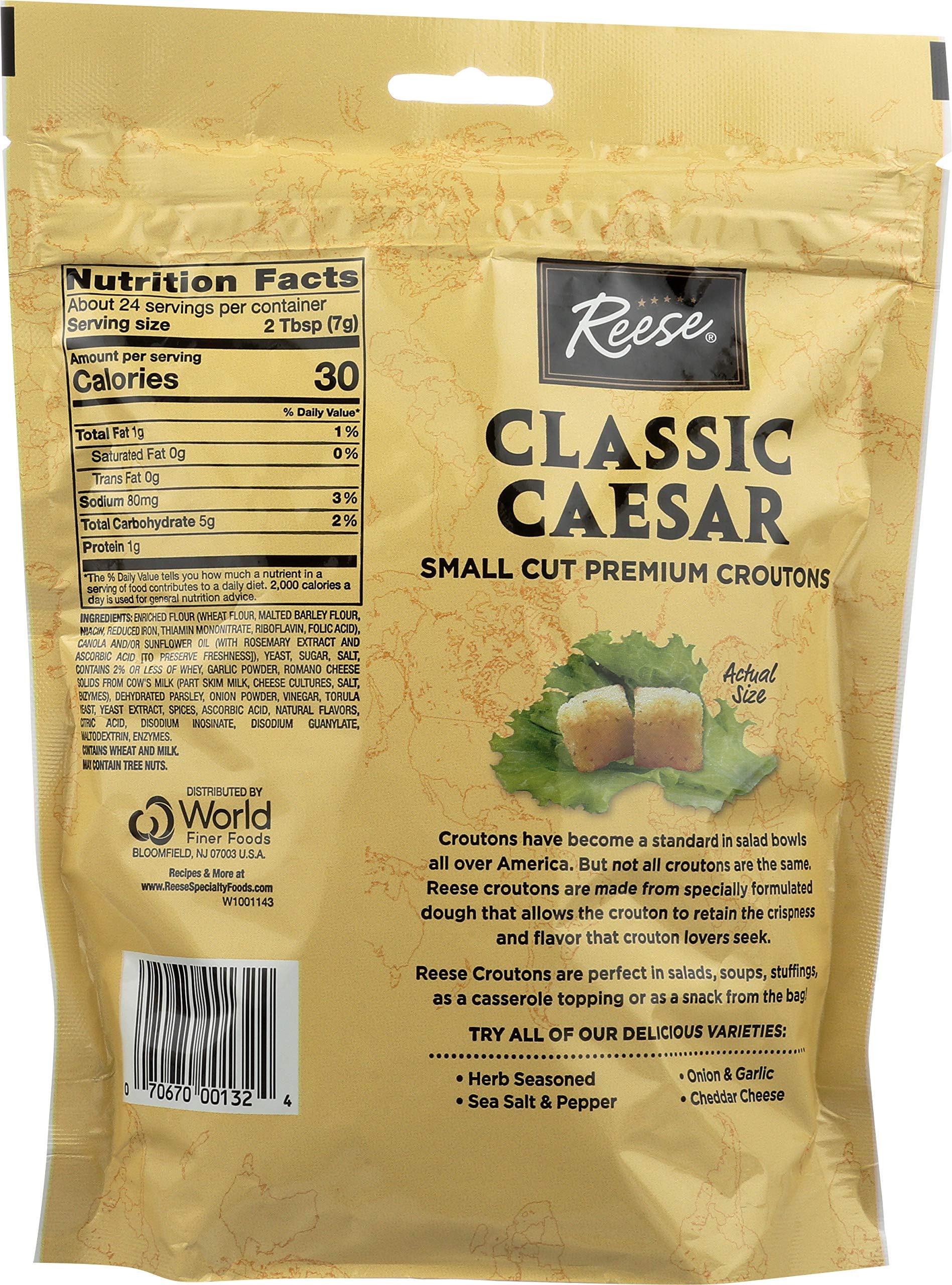 Reseal for freshness. Reese quality since 1947. Croutons have become a standard in salad bowls all over America. But not all croutons are the same. Reese croutons are made from specially formulated dough that allows the crouton to retain the crispness and flavor that crouton lovers seek. Reese croutons are perfect in salads, soups, stuffings, as a casserole topping or as a snack from the bag! www.ReeseSpecialtyFoods.com. Recipes & more at www.ReeseSpecialtyFoods.com. Try all of our delicious varieties: Herb seasoned; onion & garlic; sea salt & pepper; cheddar cheese.