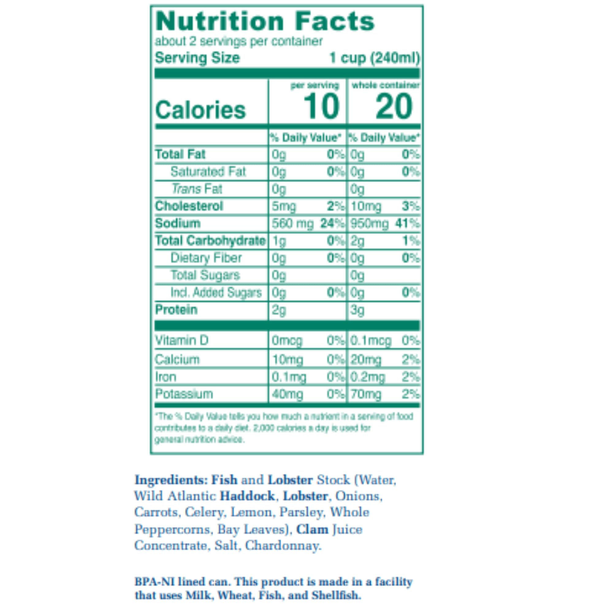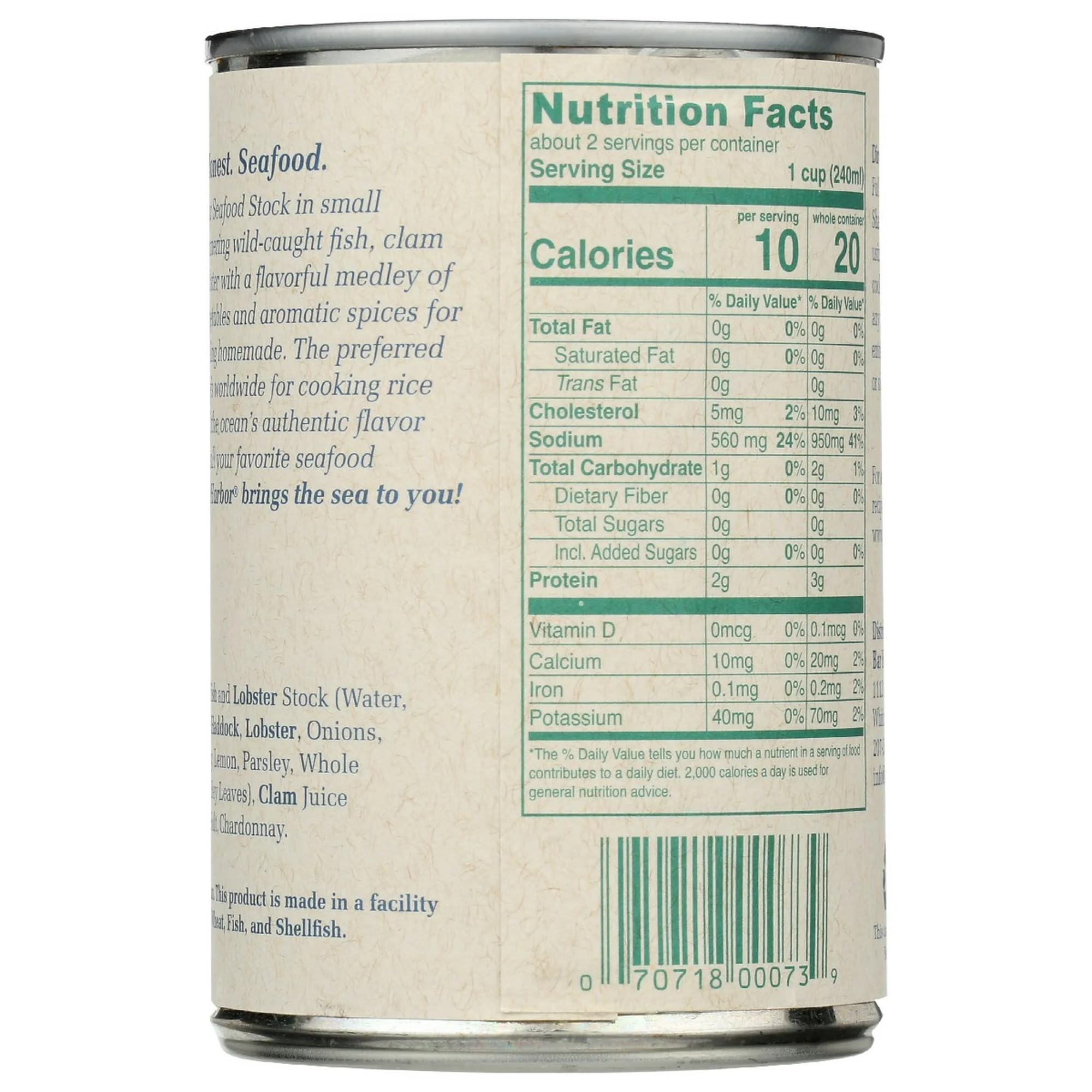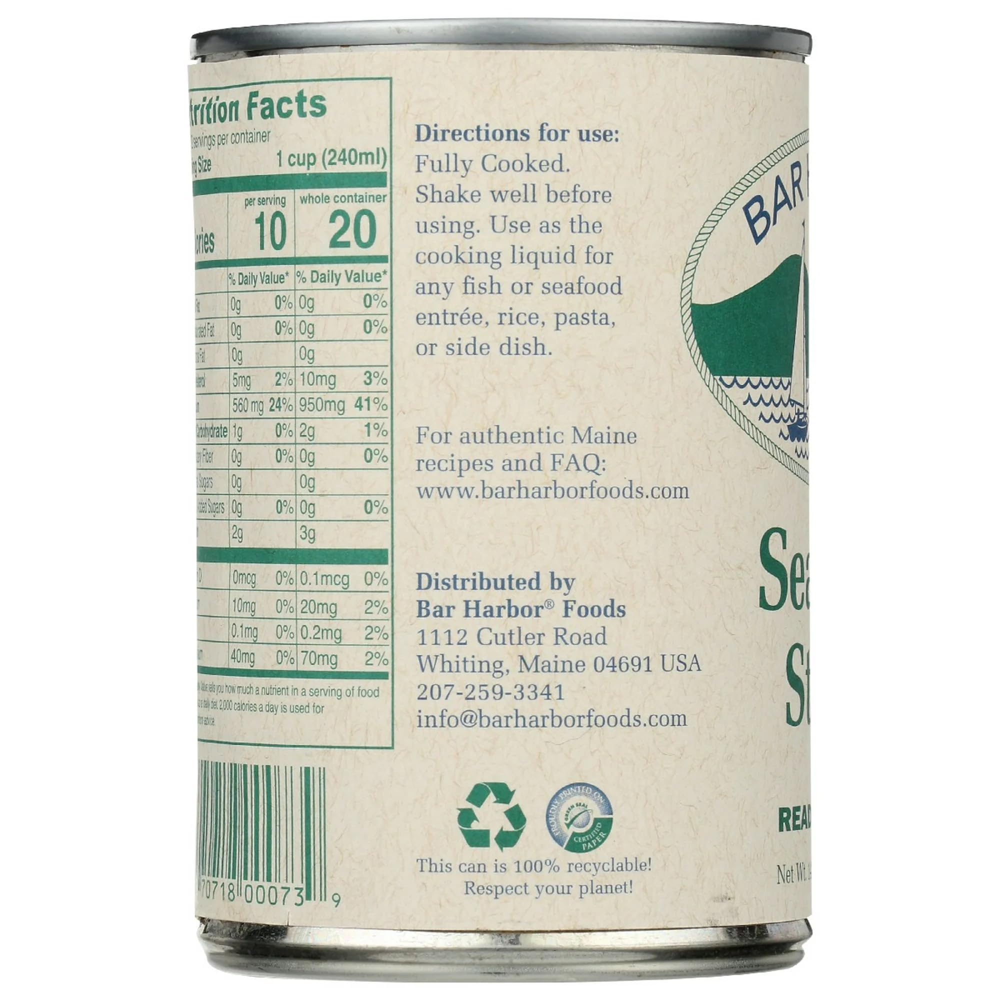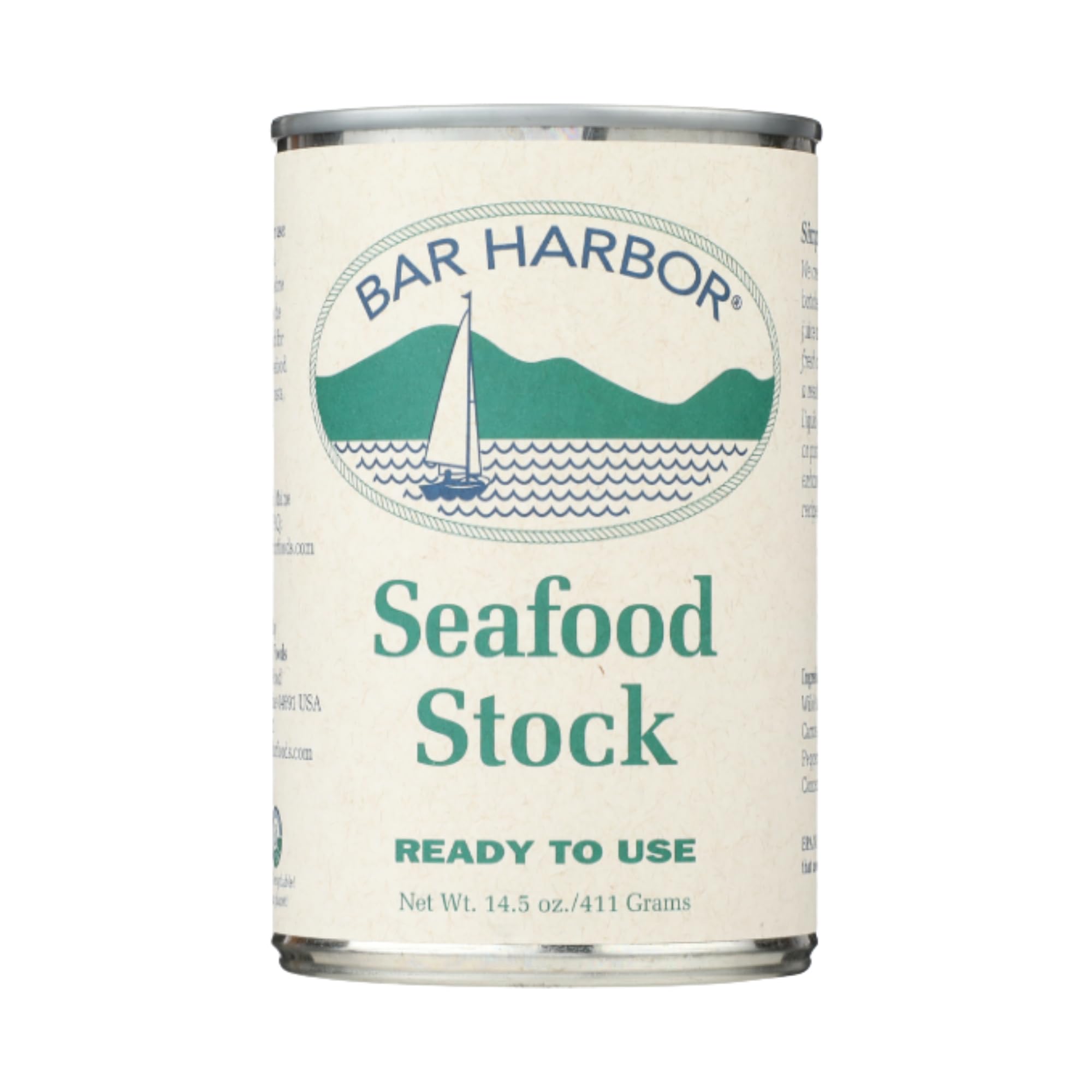 Bar Harbor Foods Seafood Stock, 15 Ounce 6 per case. On the coast of Maine, honest, delicious food is part of our heritage. Bar Harbor offers authentic all-natural seafood specialties fresh from the cold, clear waters of the North Atlantic. We hand sort every mussel, clam and lobster, and prepare all our foods in small batches in our kitchen on Holmes Bay, using all-natural ingredients, pure and simple. You can taste the difference!. Seafood Stock Ingredients: Clam Stock, Certified Maine Lobster Stock, Wild-caught Fish Stock, Onion, Celery, Carrots, Dry White Wine, Bay Leaves, Salt, Whole Peppercorns, Garlic, Parsley No artificial preservatives! No MSG! No trans-fat!