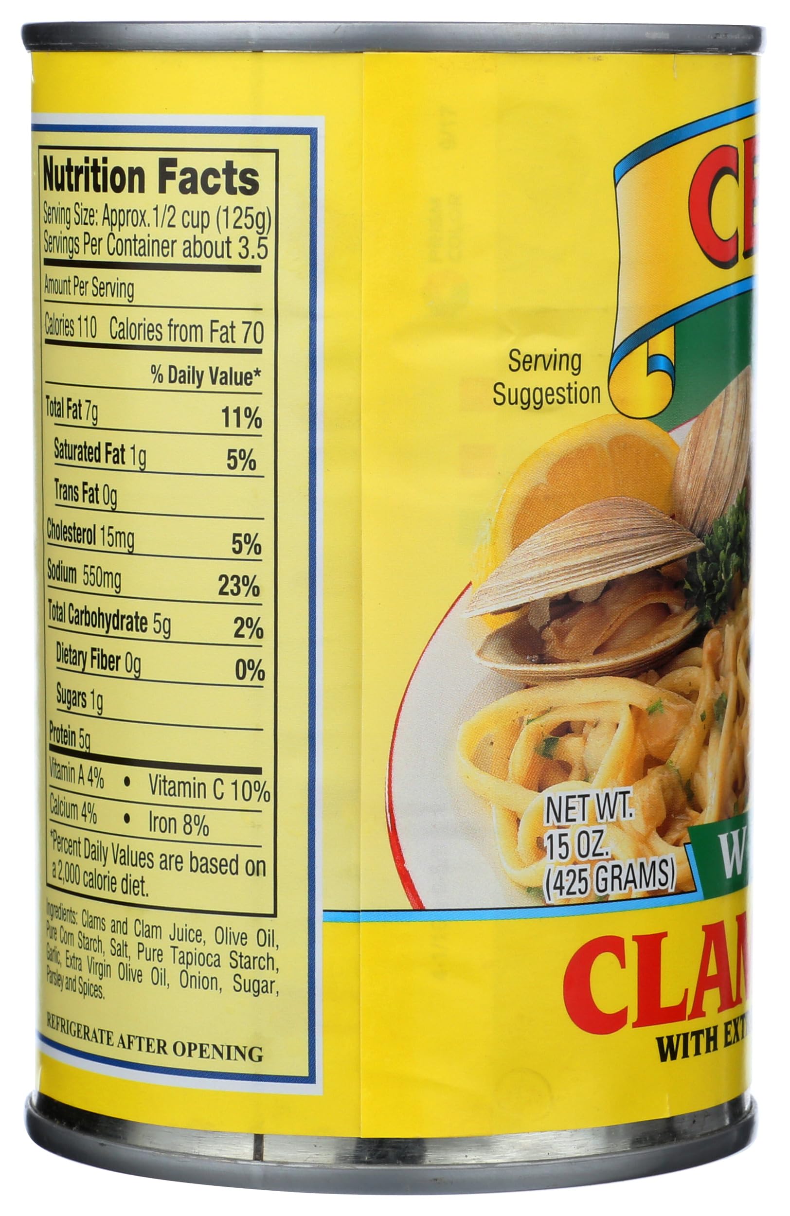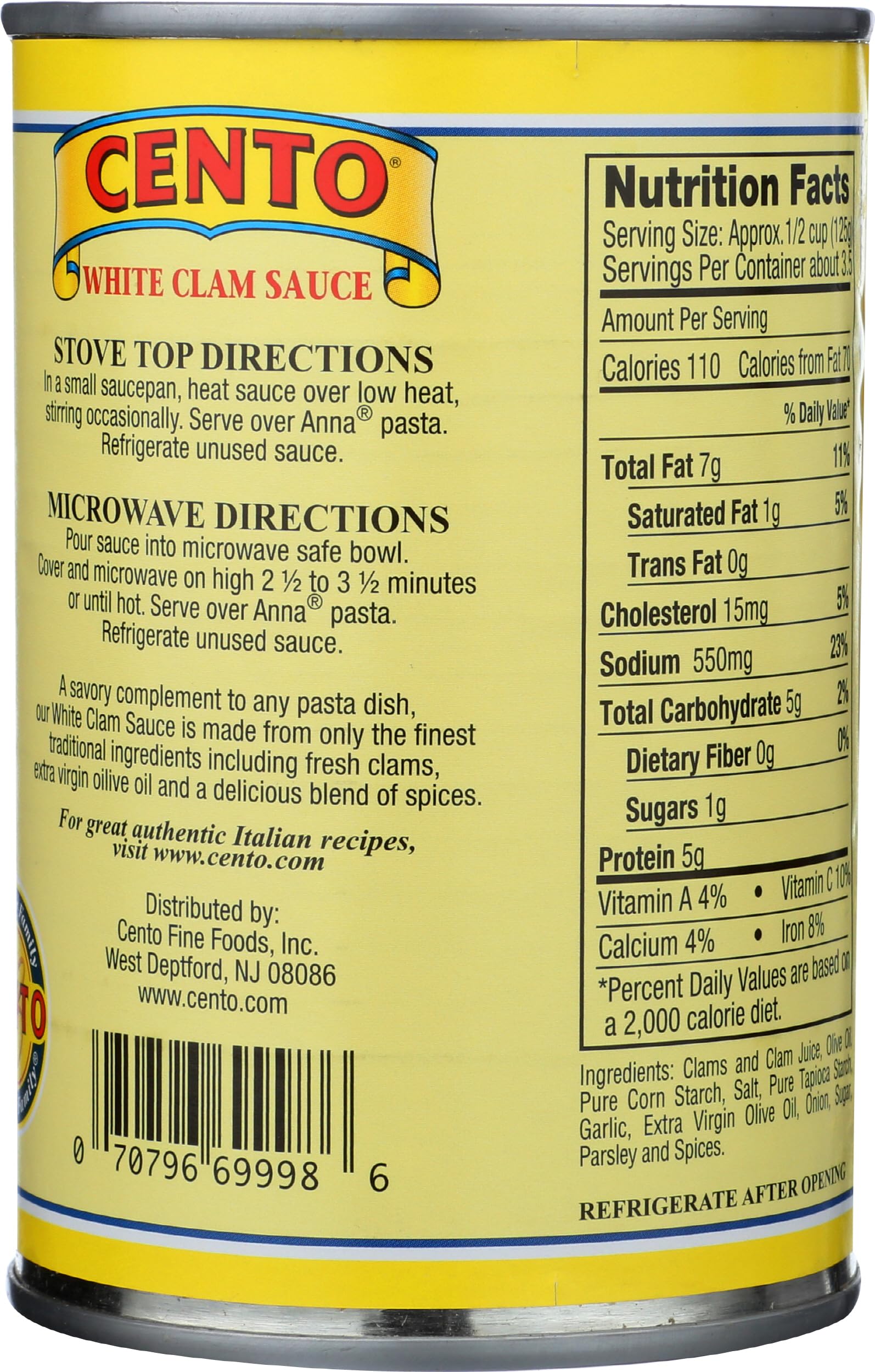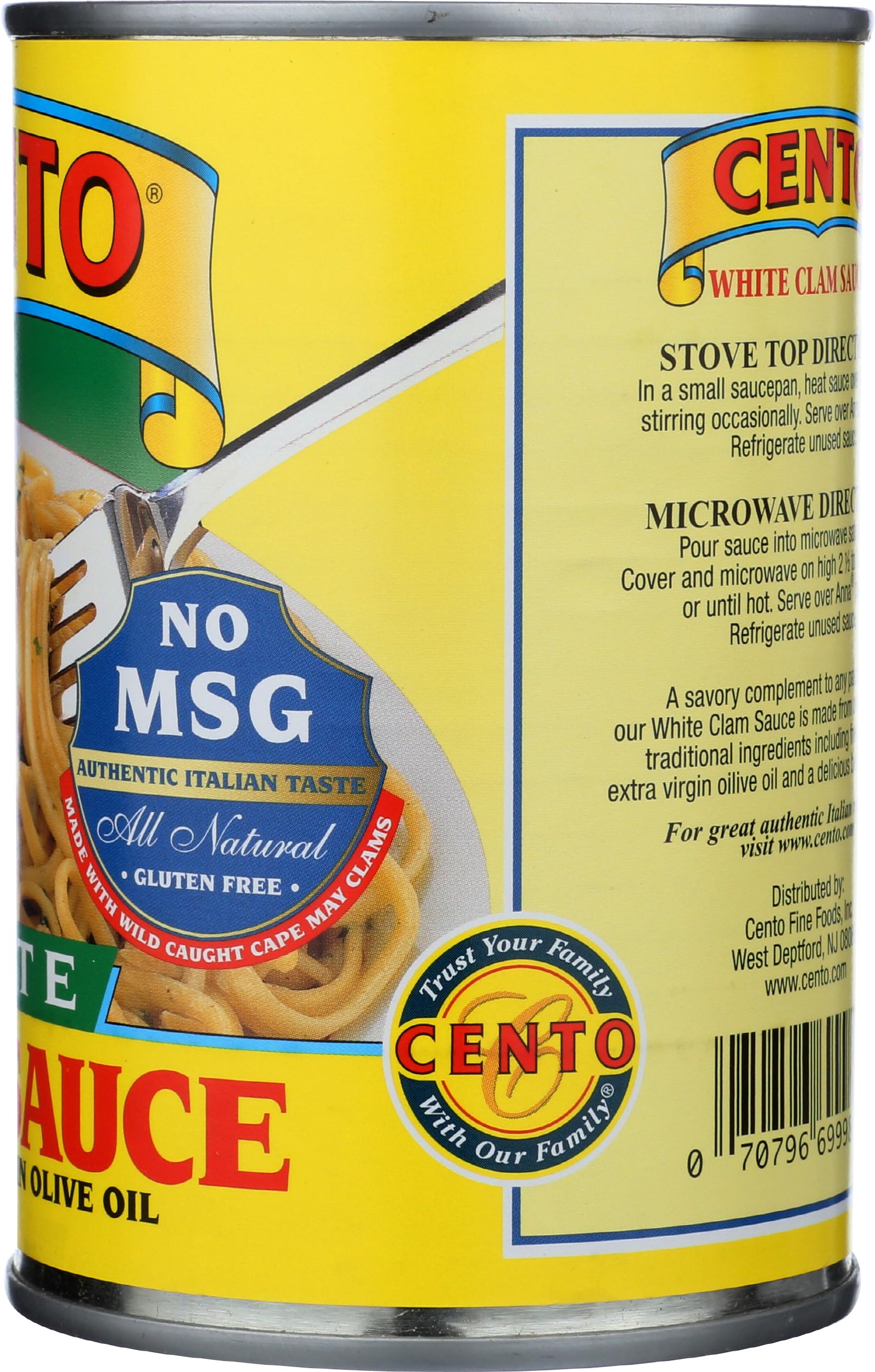 100% natural wild caught clams. A savory complement to any pasta dish, our White Clam sauce is made from only the finest traditional ingredients including fresh clams extra virgin olive oil and a delicious blend of spices. Trust your family with our family. www.cento.com. Non-intent BPA free can lining.