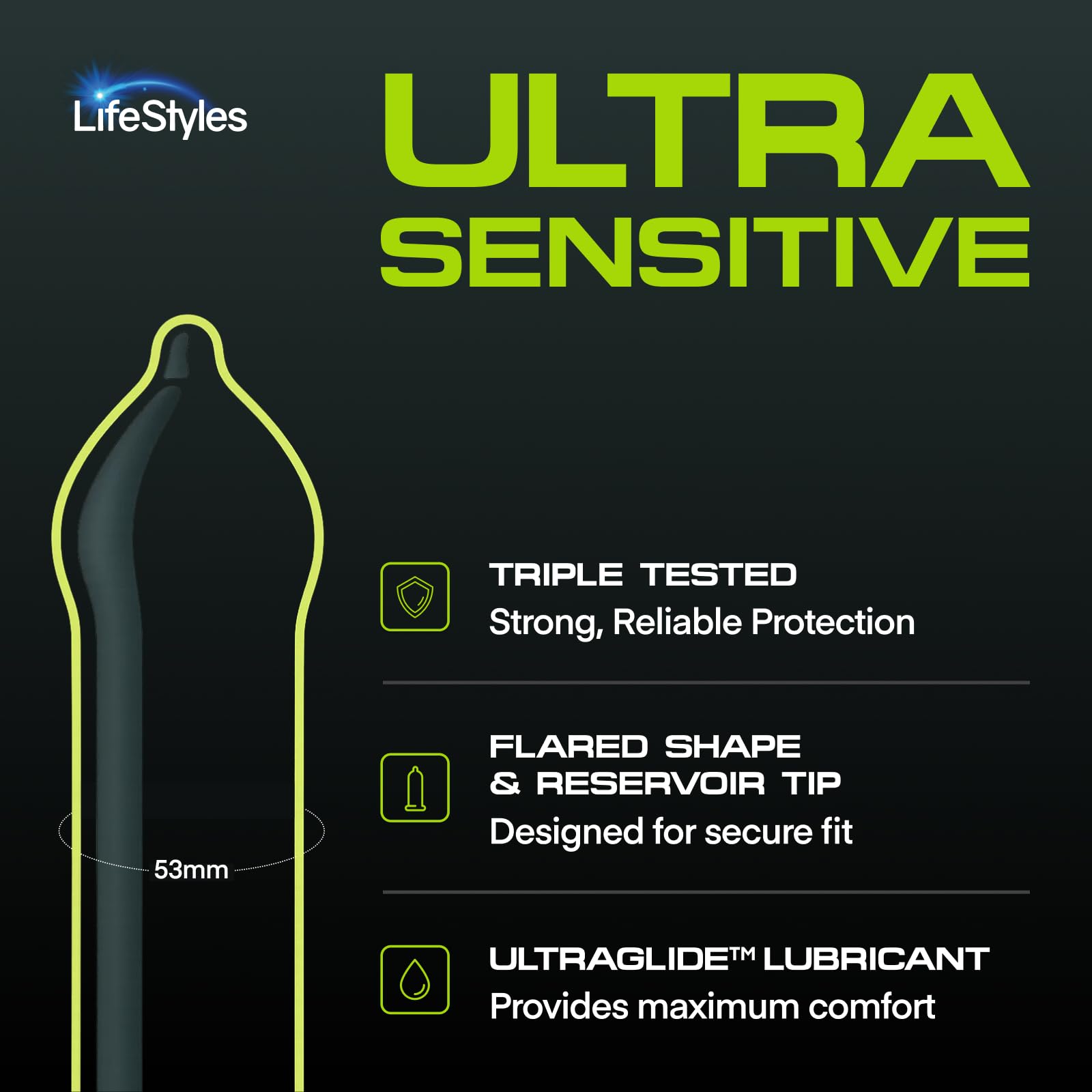 This Changes Everything! Lifestyles unique, comfortable, stretchable latex and scientifically engineered condoms shapes offer the safe, ultra-sensual experience you've been looking for. Feel more of her so she can feel more of you. Ultra Sensitive condoms enhance sensitivity for a more natural, pleasurable feel.