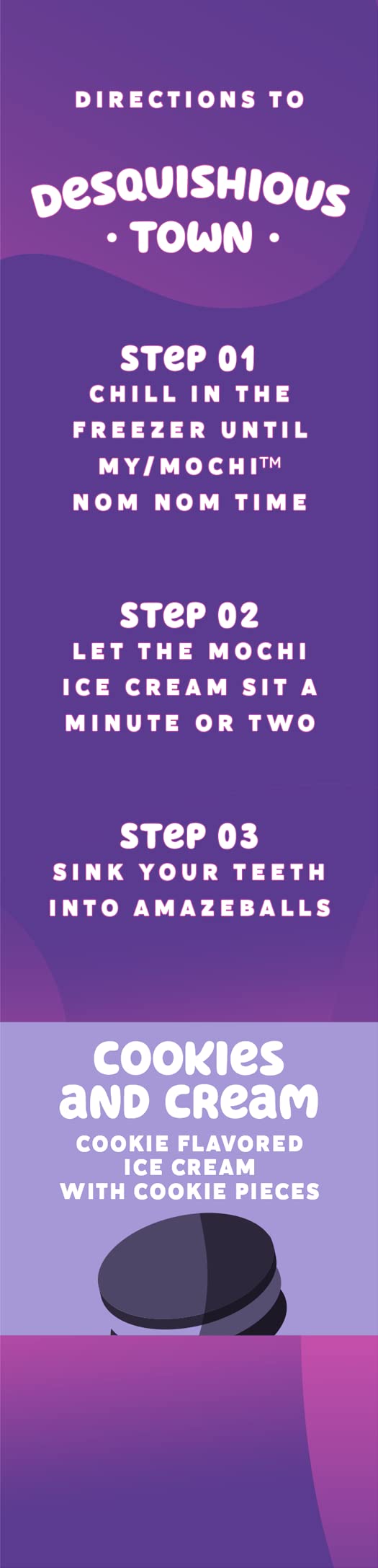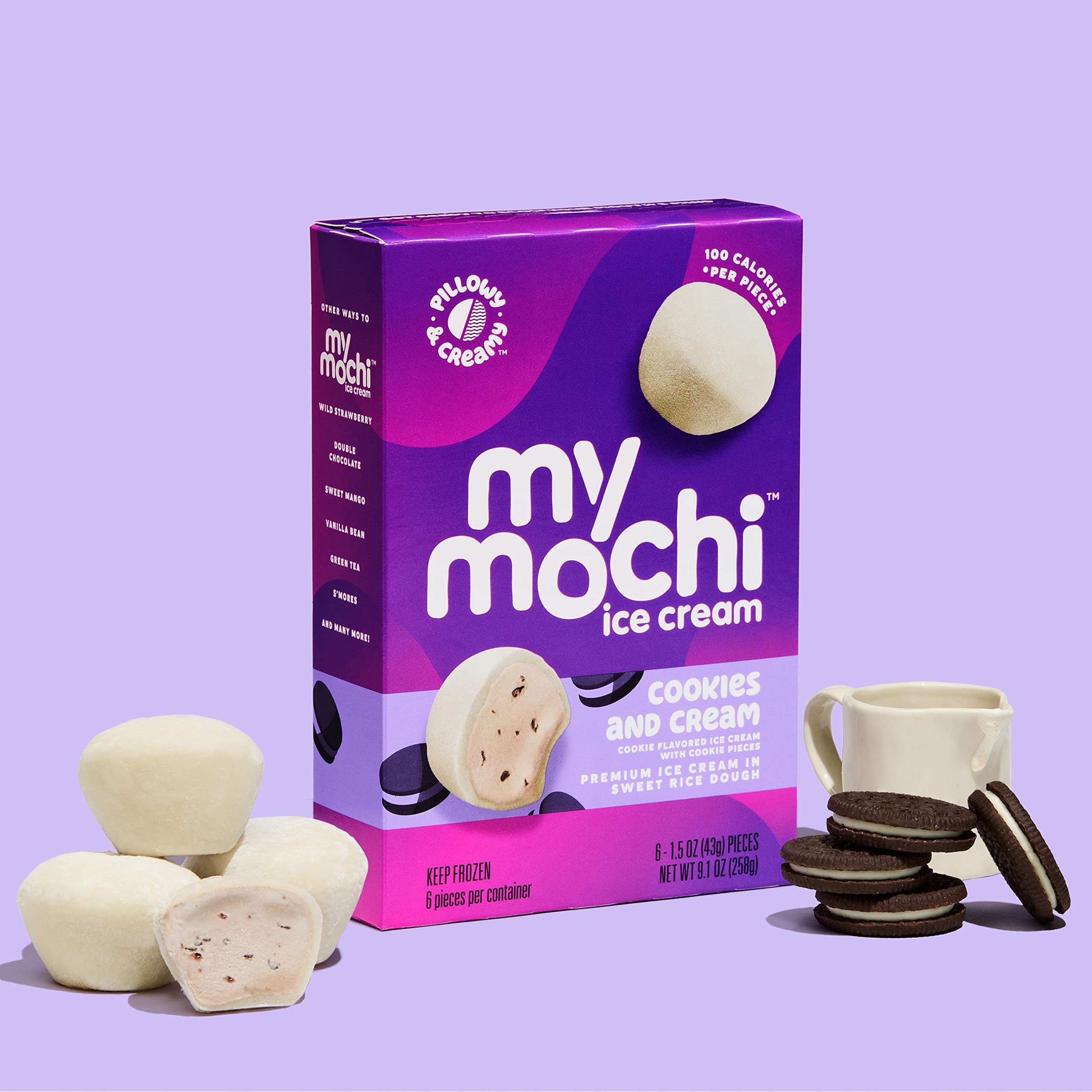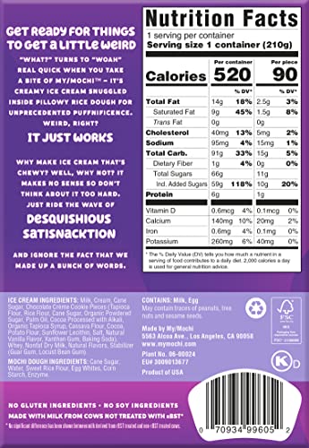 Cookies & Cream My/Mochi Ice Cream is the perfect combination of rich, premium ice cream and crisp, chocolatey cookies wrapped in mushy, mochi dough. A new kind of yum in your handheld snack…because nobody craves same-old.