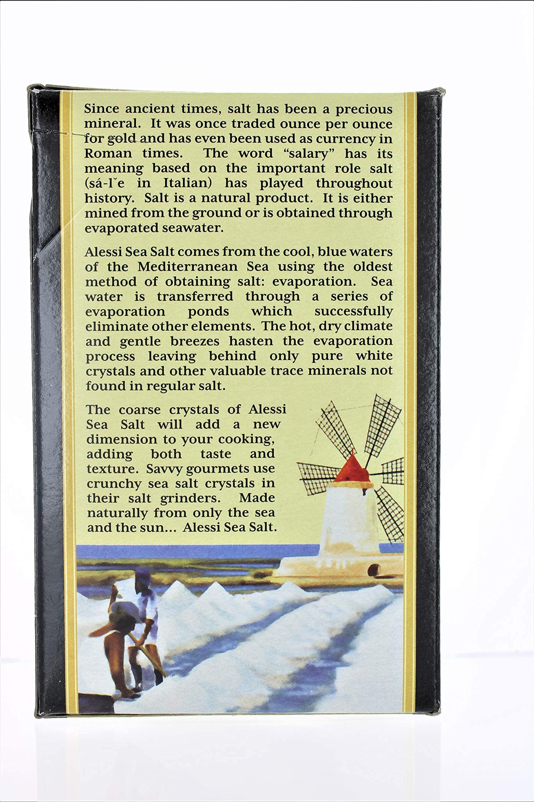 Alessi Sea Salt comes from the cool, blue waters of the Mediterranean Sea using the oldest method of obtaining salt, evaporation. Sea water is transferred through a series of evaporation ponds which successively eliminate other elements. The hot, dry climate and gentle breezes hasten the evaporation process leaving behind only pure white crystals and other valubale trace minerals not found in regular salt. The fine crystals of Alessi Sea Salt will enhance the flavor of any food exactly as those whoe resided in antiquity. Made naturally from only the sea and the sun..