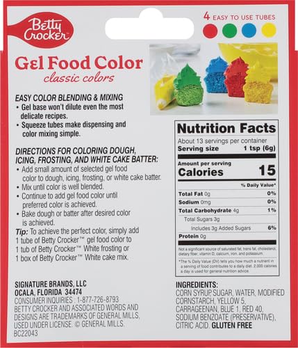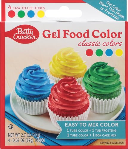 For use in coloring cookie dough, icing, and cake Batter. Easy-to-use tubes for easy Color blending and mixing. Won't dilute even the most delicate recipes. No drip gel formula. This 4.25x5 inch Package contains four tubes of gel food coloring in blue, green, yellow and red. Made in USA.