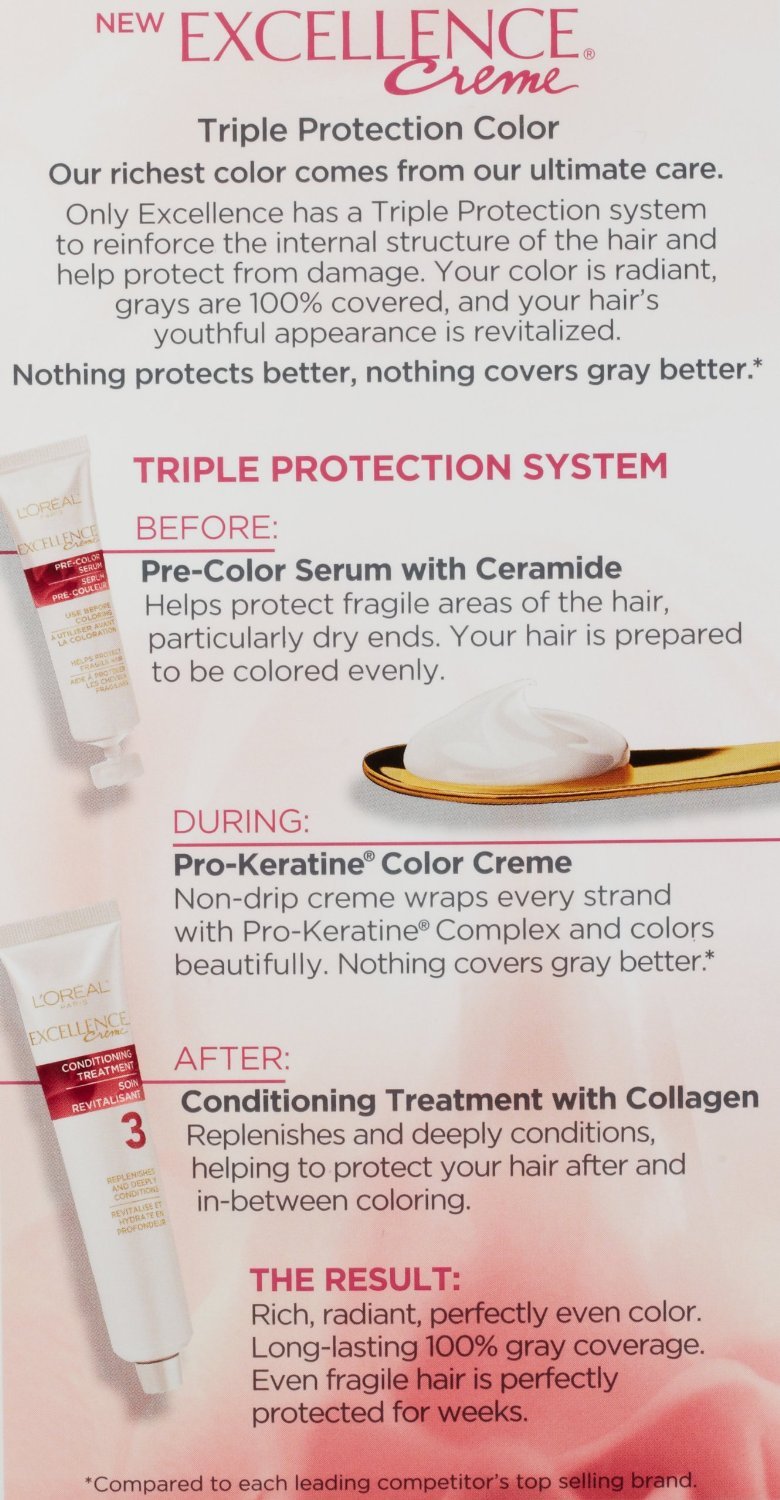 L’Oréal’s Excellence Triple Protection Color Cremes Protect, Replenish & Condition so hair takes and keeps color beautifully. Super rich, incredibly radiant with 100% long-lasting gray overage. Our richest color comes from our ultimate care. Only Excellence has a Triple Protection system to Reinforce the internal structure of the hair and help Protect from damage. Your color is Radiant, grays are 100% covered, and your hair's youthful appearance is Revitalized. Nothing protects better, nothing covers gray better.* That’s Excellence.