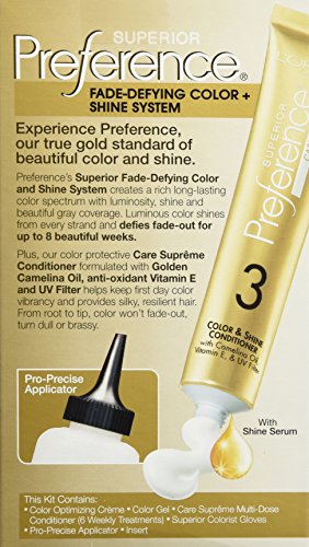 Since 1973, L'Oréal Superior Preference has been our gold standard in permanent hair color – delivering extraordinary shine and luminous hair color that lasts and lasts. What makes Superior Preference hair color so special is our unique Fade-Defying Color and Shine System that pairs our translucent gel formula with our famous Care Supreme Conditioning treatment. The end result is beautifully crafted, long lasting hair color with depth and dimension. Available in over 50 luminous shades so you can find your own signature color.