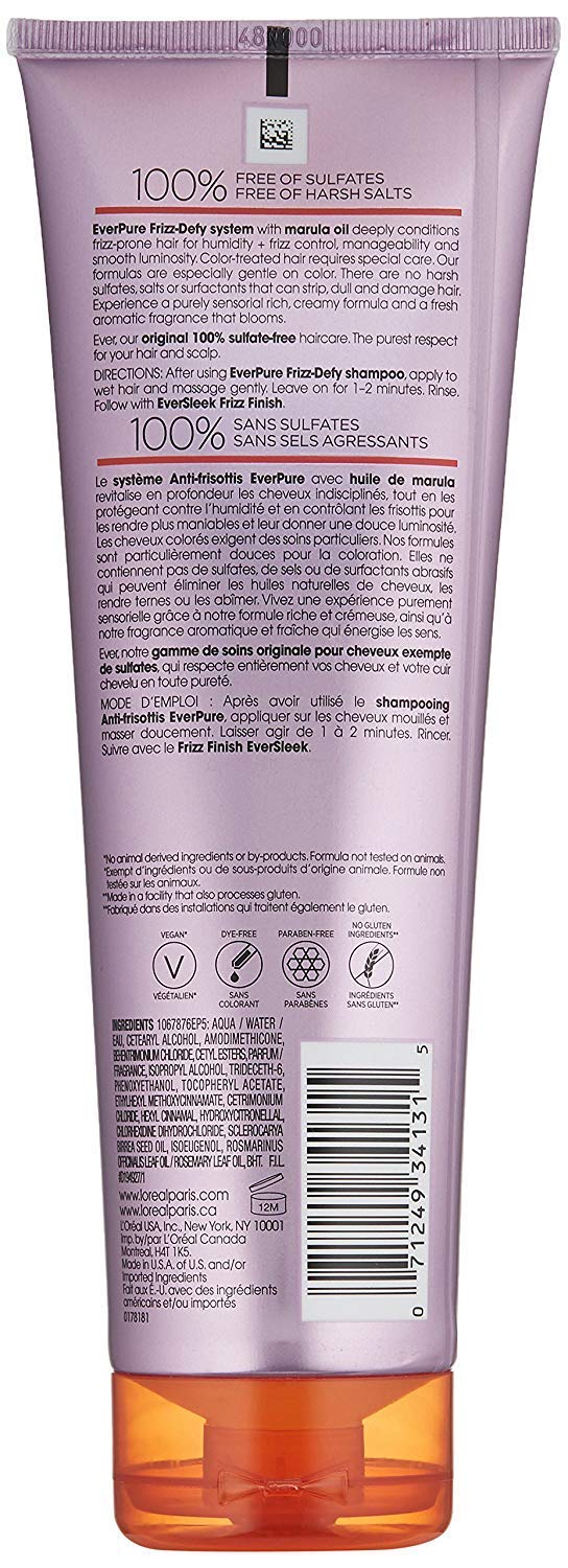 L’Oral Paris EverPure Frizz-Defy sulfate free conditioner with marula oil is a deep conditioner for humidity protection and frizz resistance up to 24 hours. Our formulas are especially gentle on color treated hair. There are no harsh sulfates, salts, or surfactants that can strip, dull and damage hair. Experience a purely sensorial rich, creamy formula and a fresh aromatic fragrance that blooms. • Humidity and Frizz Control • Sulfate Free • Anti-Fade • Marula Oil After using EverPure Frizz-Defy shampoo, apply to wet hair and massage gently. Leave on for 1-2 minutes. Rinse. Follow with EverSleek Frizz Finish.