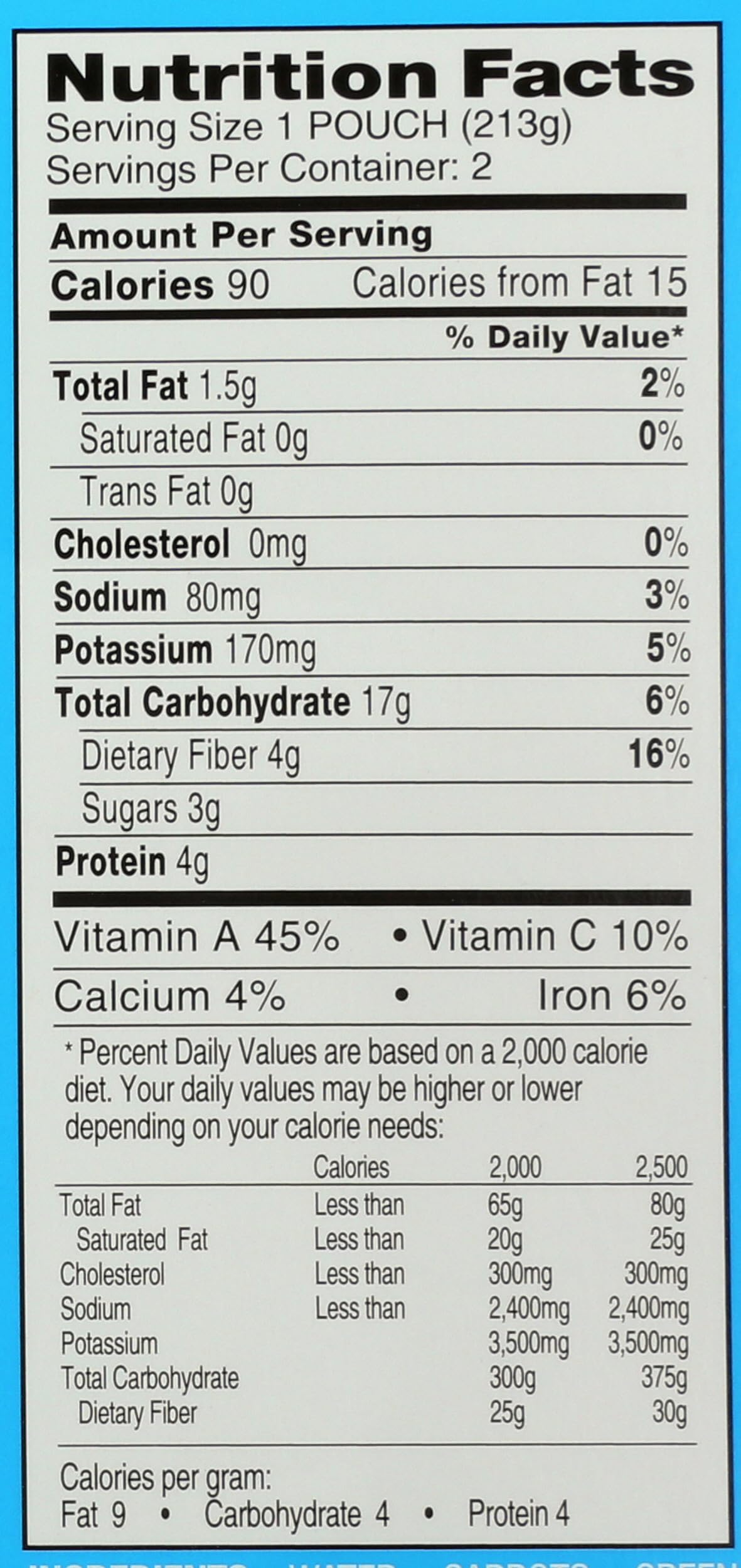 One microwaveable cooking pouch. Ingredients: Water, Enriched Egg Noodles (Durum Flour, Eggs, Niacin, Ferrous Sulfate, Thiamin Mononitrate, Riboflavin and Folic Acid), Carrots, Natural Chicken Flavor Base (Salt, Hydrolyzed Corn Protein, Chicken Flavor, Chicken Fat, Sugar, Onion Powder, Garlic Powder. .
