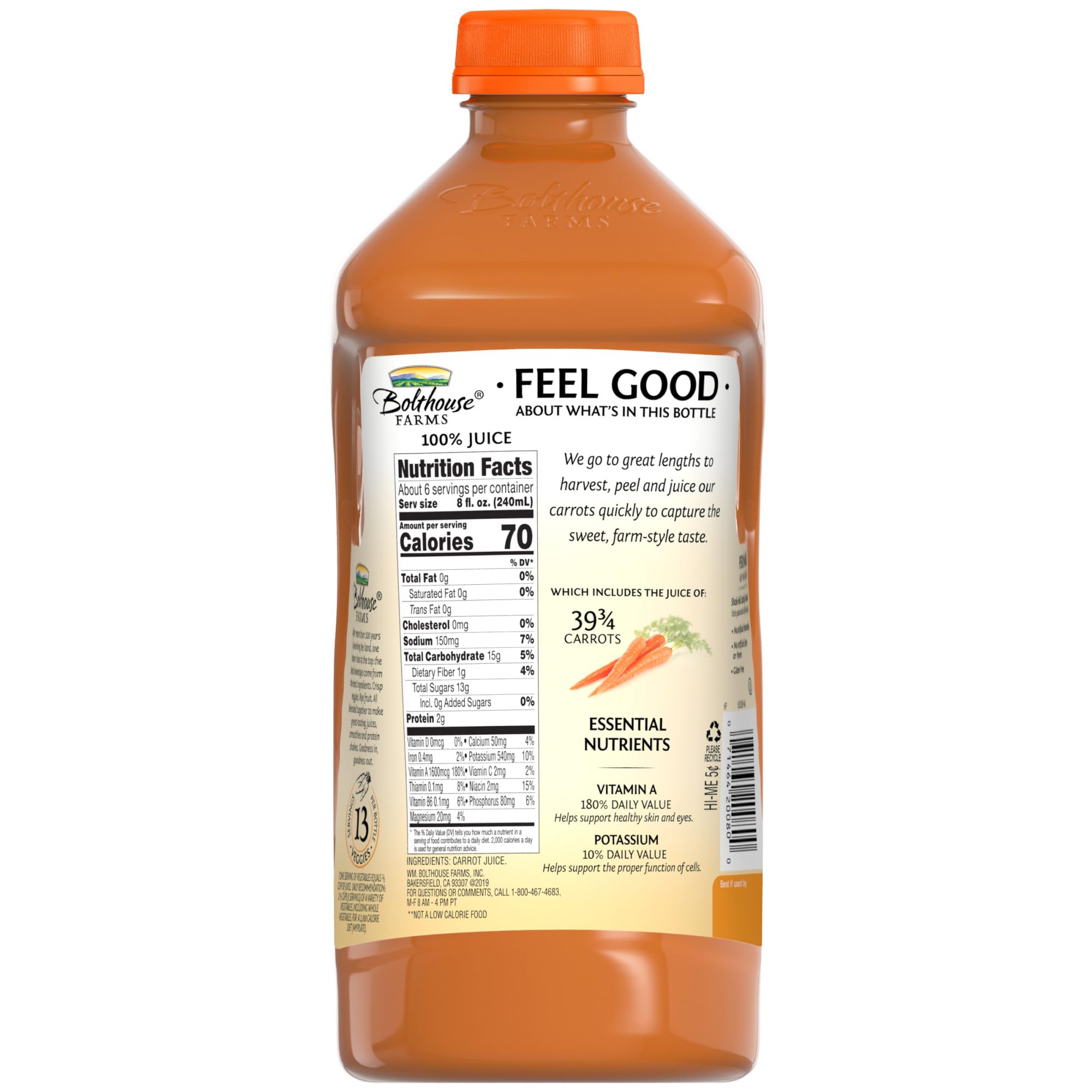 The fresh carrots in this juice are grown the way nature intended. With almost 3 servings of veggies per bottle, nothing gets in the way of the pure, sweet flavor of Bolthouse Farms carrots.