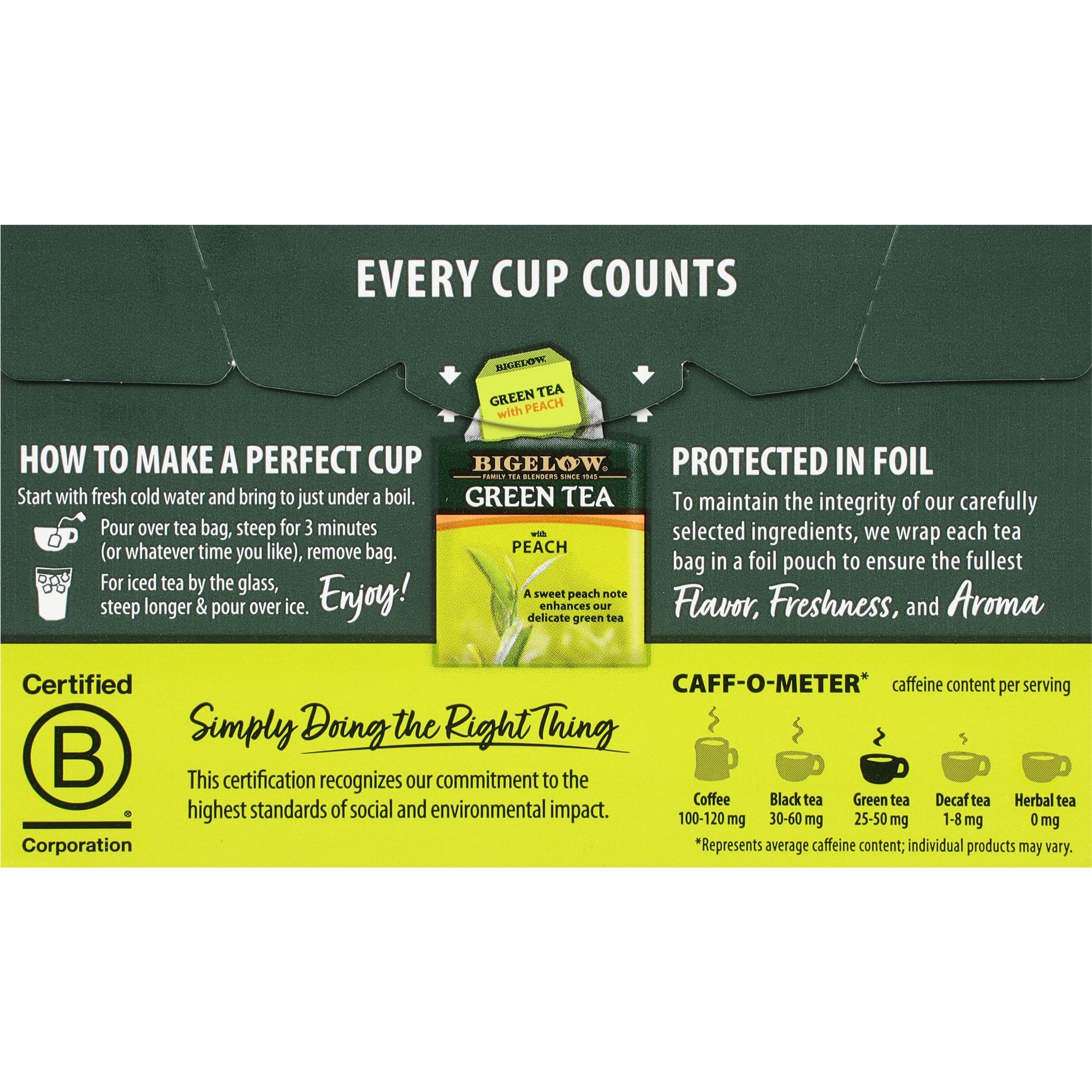 Individual fresh pack. Delicate flavor. Healthy antioxidants. Each tea bag individually wrapped. Take your favorite tea where you go to ensure your full enjoyment. Leave it to Mother Nature and Bigelow! Mother Nature gave us a wonderful gift when she packed powerful antioxidants into green tea. But not all green tea tastes the same. Bigelow uses only the finest quality tea grown in higher-elevation gardens. It is hand picked at its peak, then carefully processed to bring out the tea's natural, smooth flavor. The delicate flavor of peaches is added. The tea bags are then wrapped in protective pouches to seal in freshness. What more can you ask for, a product that contains antioxidants and tastes great! So go ahead, enjoy a cup or two or three throughout your busy day. Bigelow Green Tea with Peach - drink it once and discover a whole new dimension in green tea enjoyment. Blended and packaged in the USA.