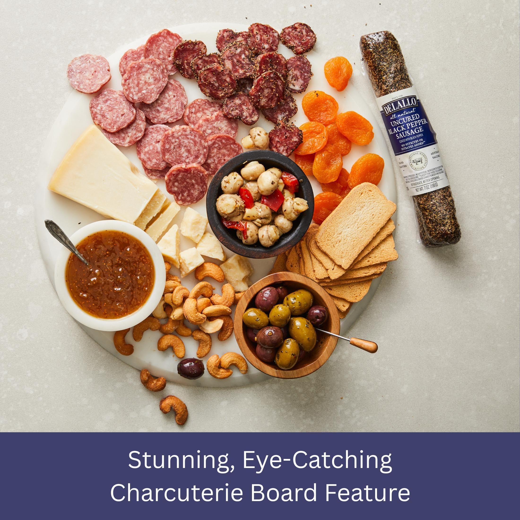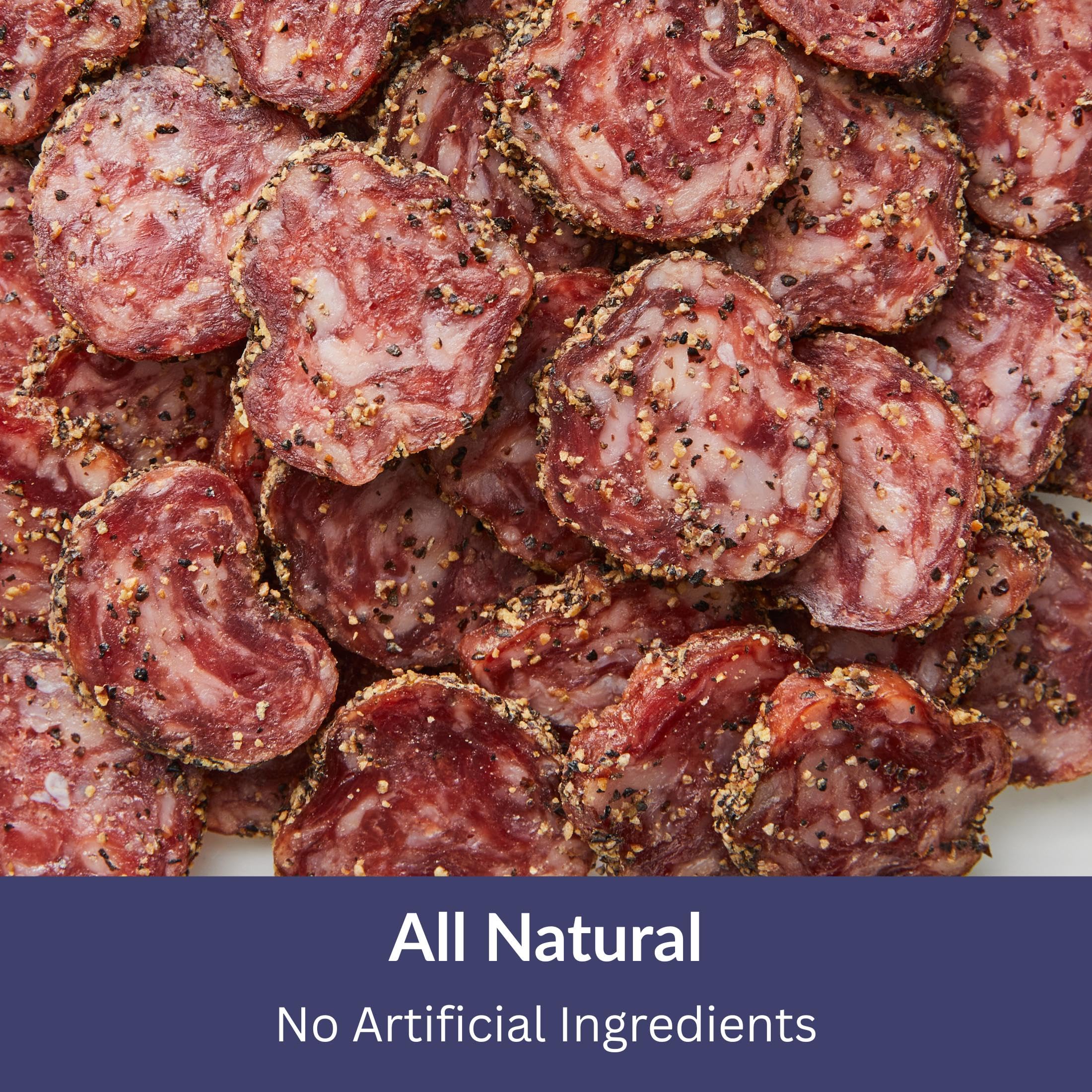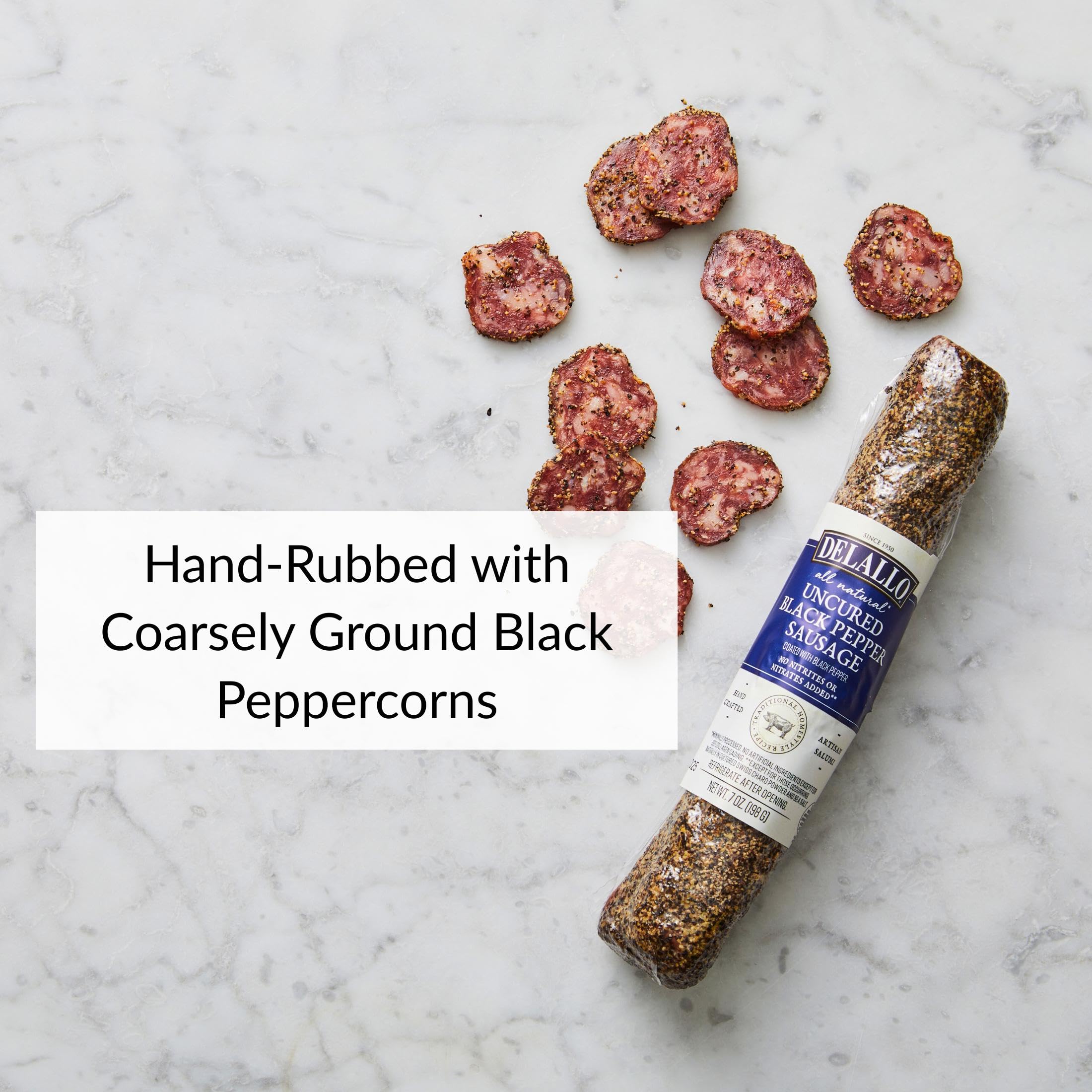 Description All-Natural Uncured Black Pepper Sausage, No Nitrites or Nitrates Added, No Artificial Ingredients DeLallo Black Pepper Dry Sausage is a traditional Italian recipe featuring finely ground pork and complementary hand-selected spices. Specially air-cured for a smooth, robust flavor, this zesty variety is hand-rubbed with ground black pepper for an added kick. Traditional Italian recipe crafted from top-quality cuts of pork. Artisanal air-curing develops its distinct smooth texture and savory, robust flavor. Hand-rubbed with coarse ground black pepper for a zesty finish. A unique, eye-catching gourmet antipasto.