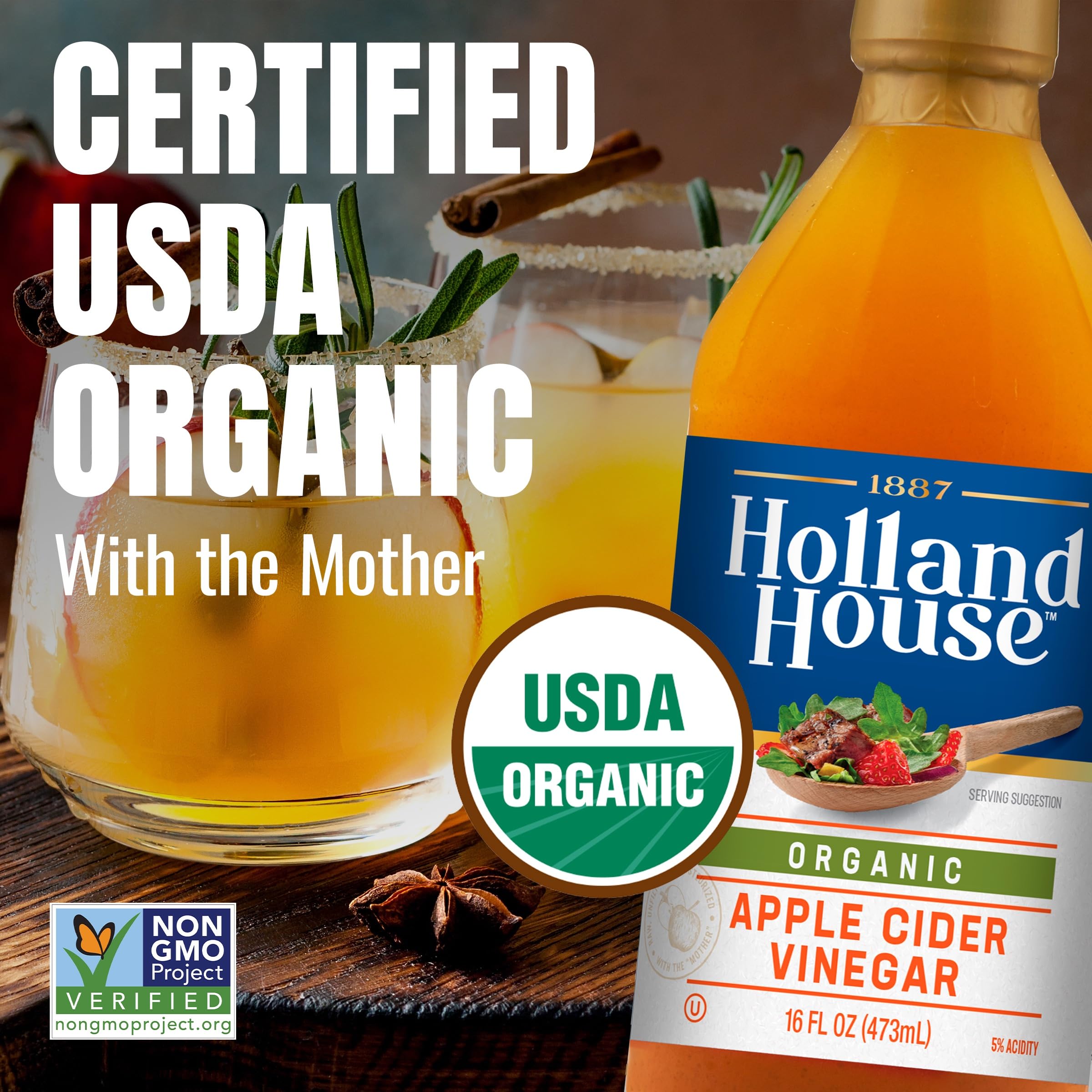 Holland House Organic Apple Cider Vinegar with the "Mother" is USDA Organic, Non-GMO Certified and Ideal for Salad Dressing, Marinade and Other Cooking, 16 FL oz
